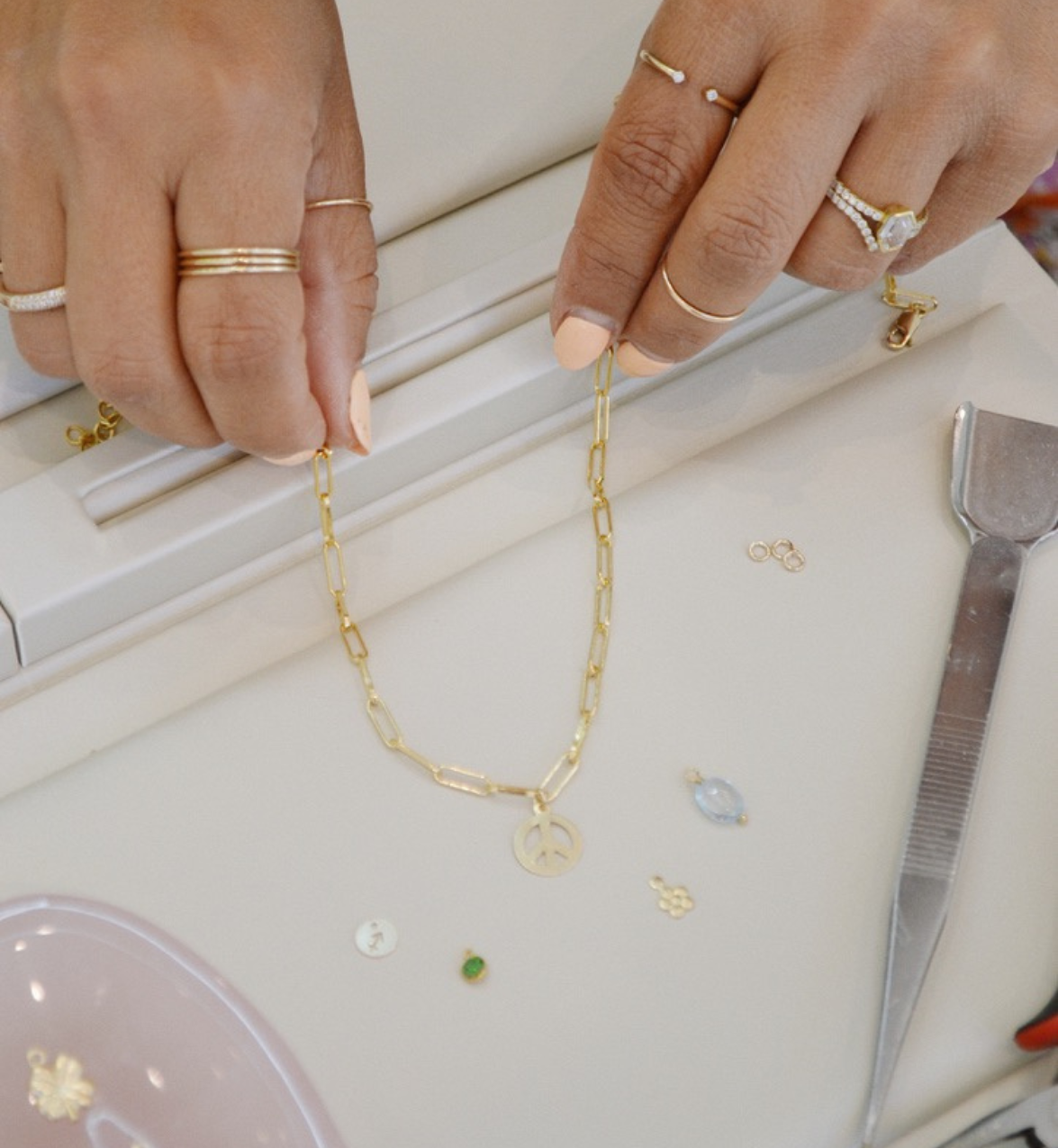 Most charm necklaces or bracelets are assembled within one hour. You’ll receive a text notification as soon as your piece is ready.