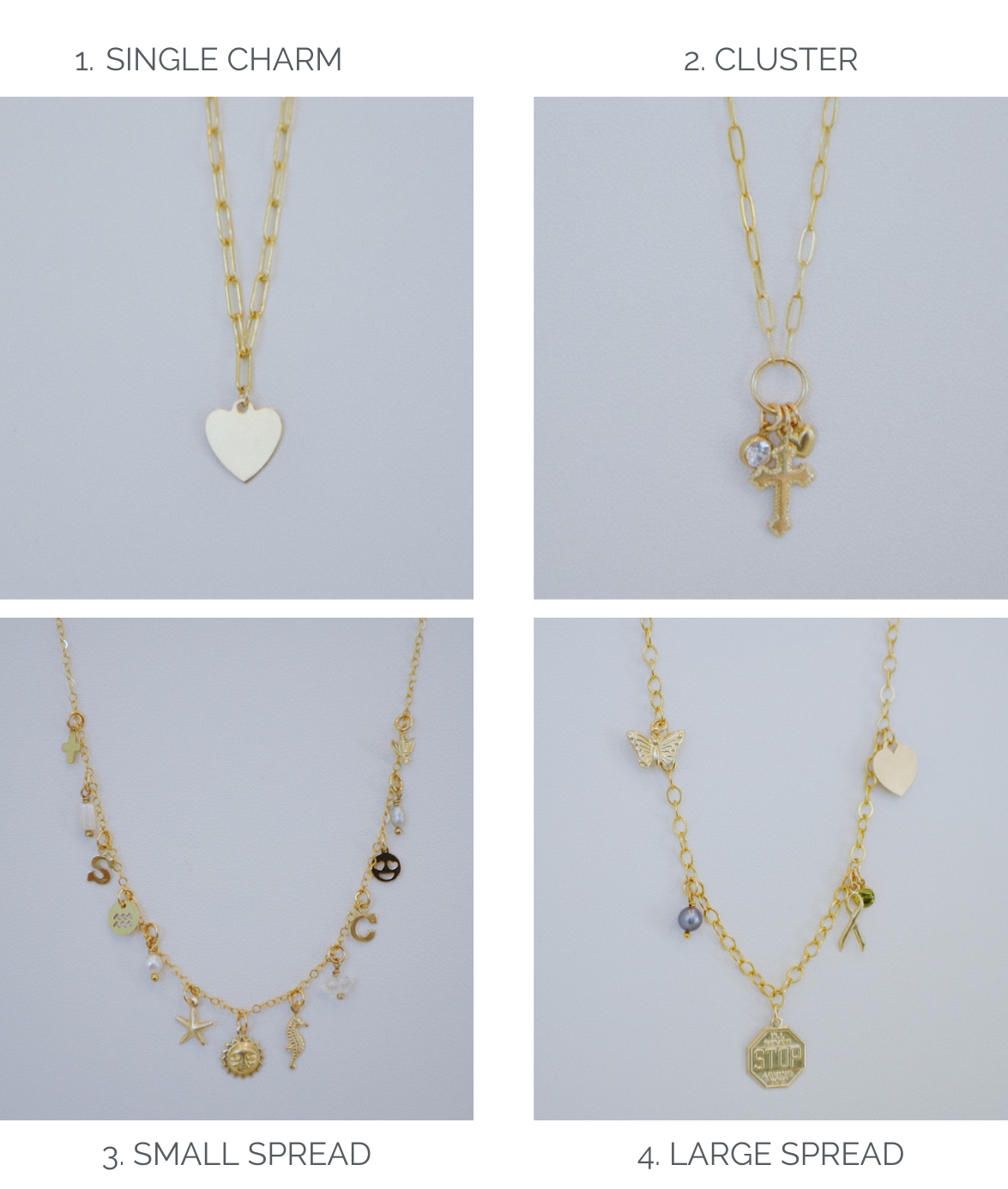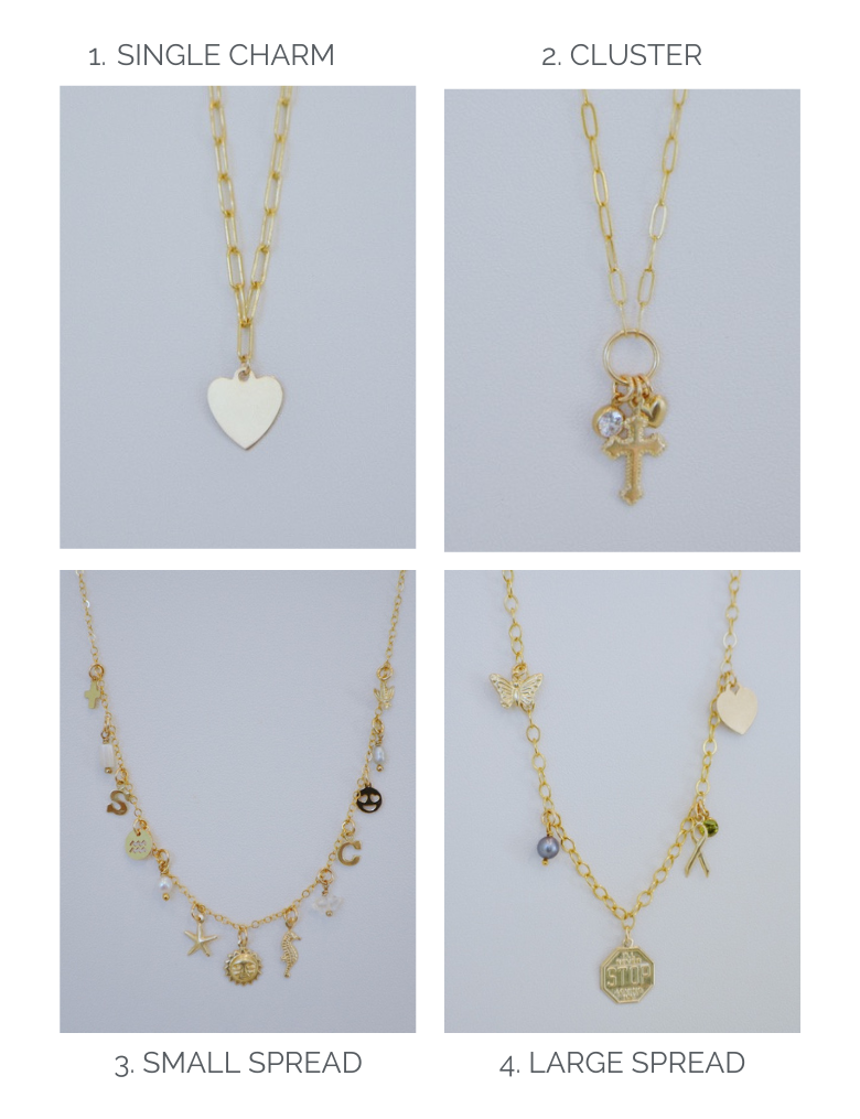 3. Small Spread: Charms spread .25-.5 inches apart. Exact length will vary depending on chain chosen.