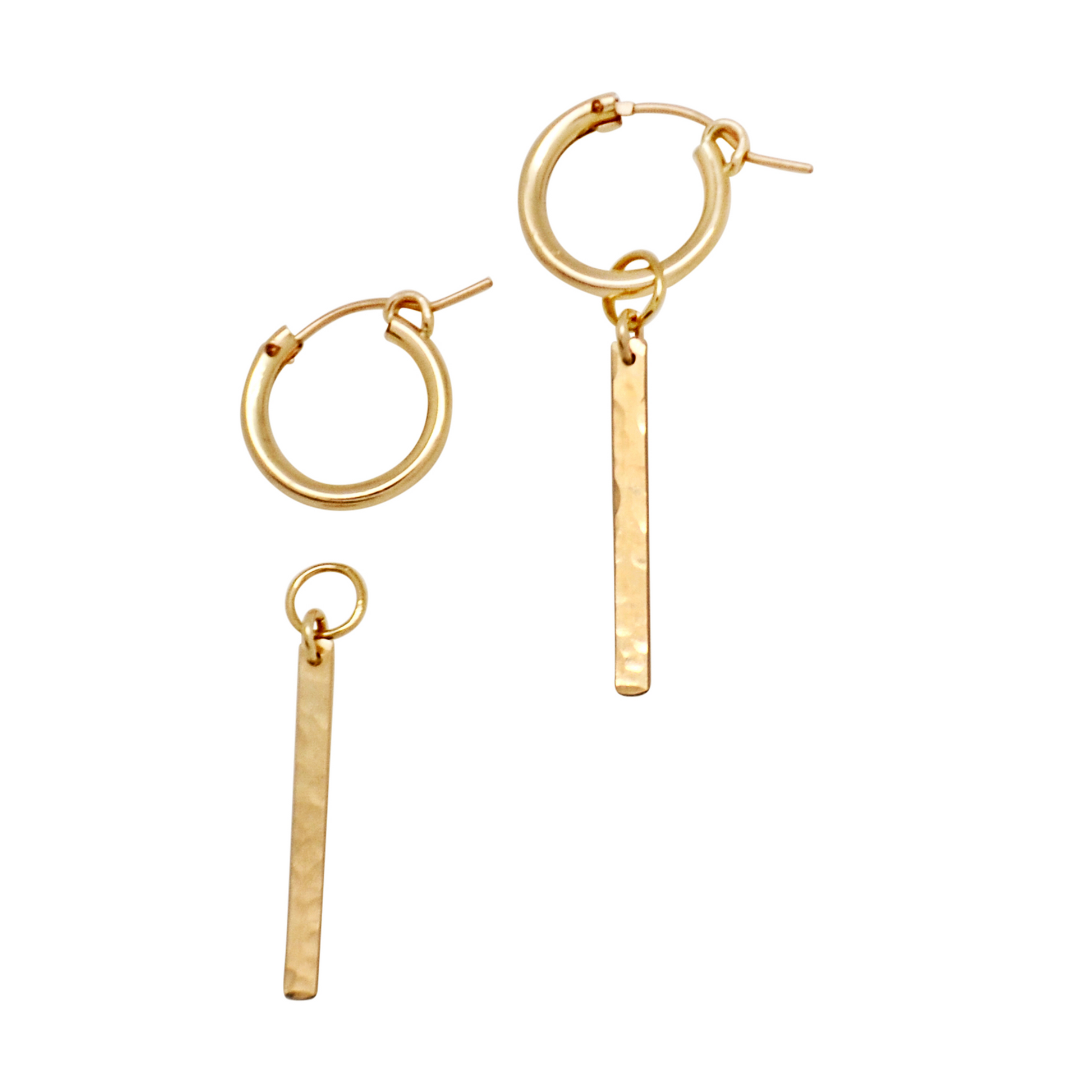 Part of our Customizable Collection - these earrings are truly versatile. With removable Drops you can wear these hoops alone or with their bar companion. Or for a completely different look take one of your drops and slip it on any of our basic chain necklaces.