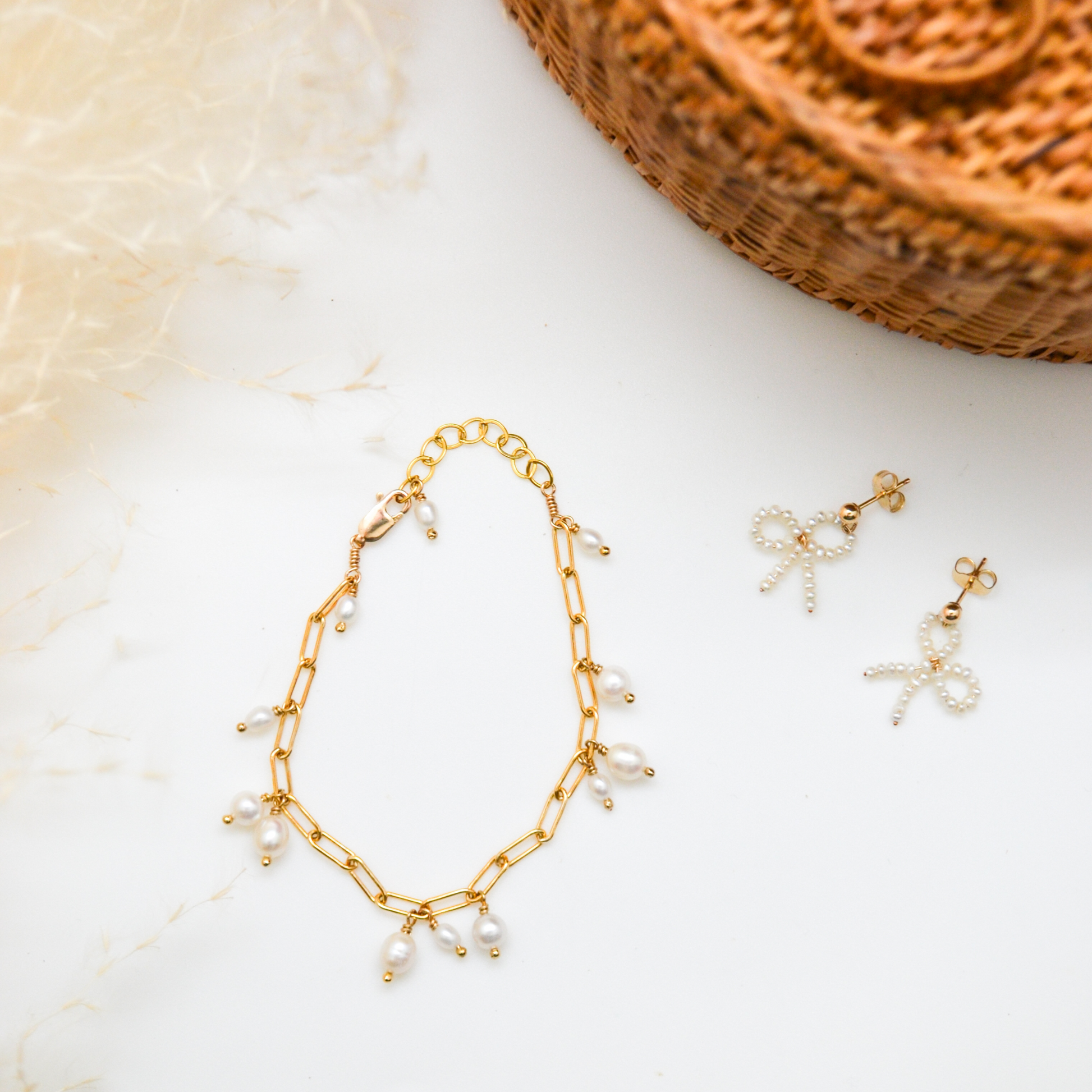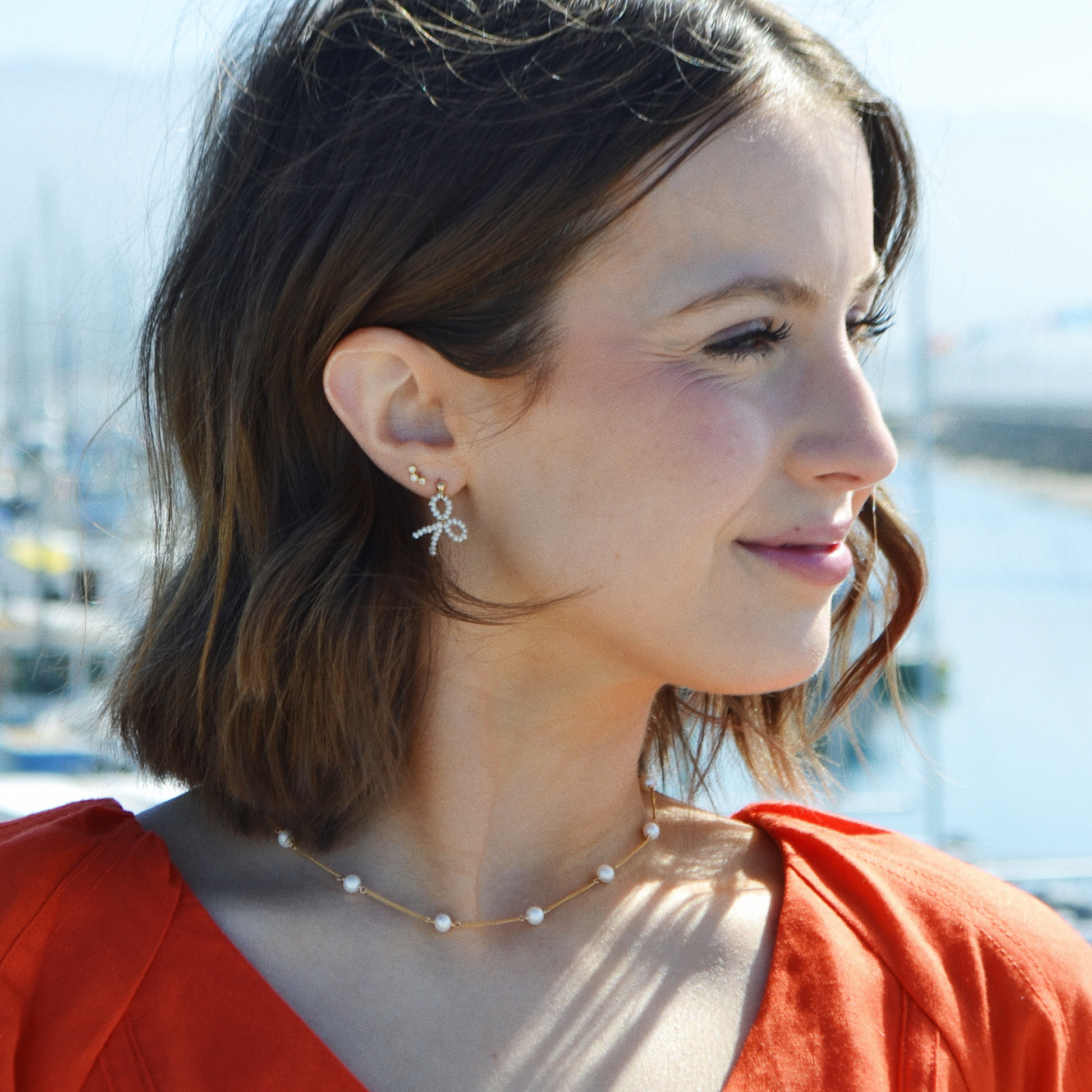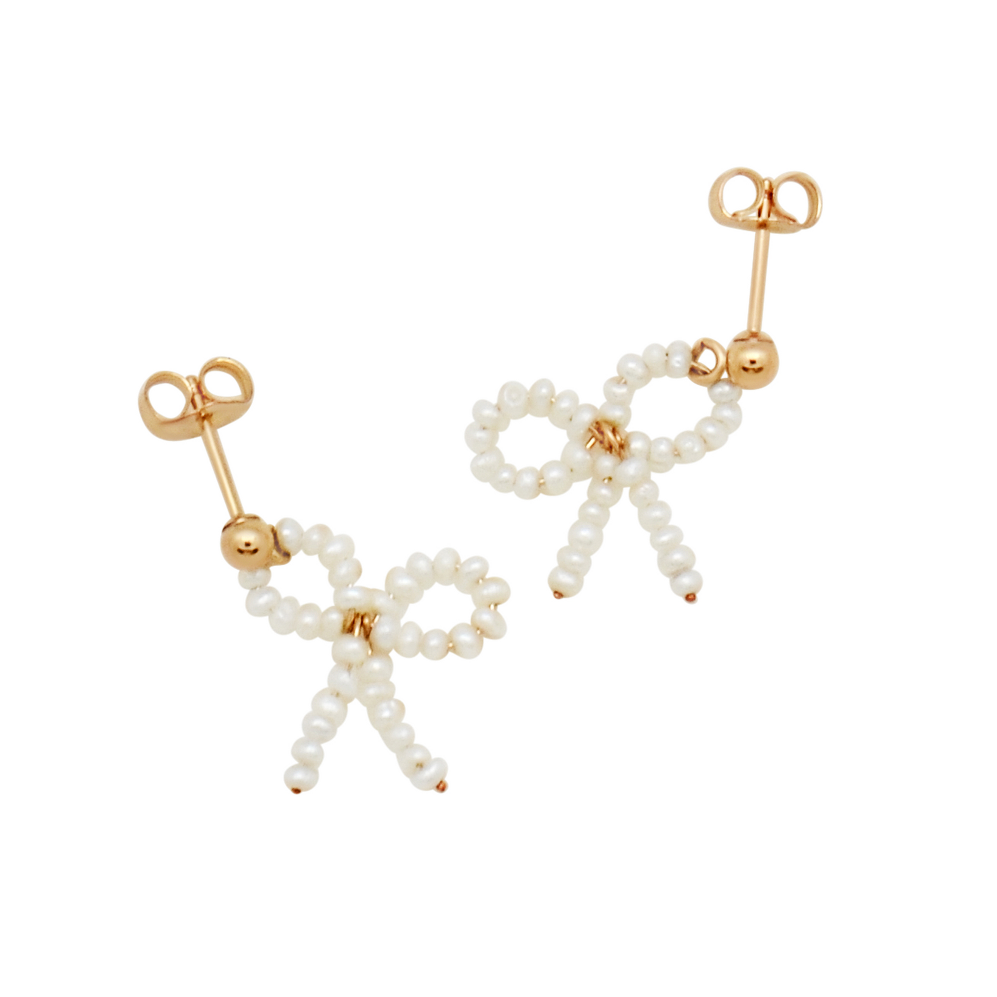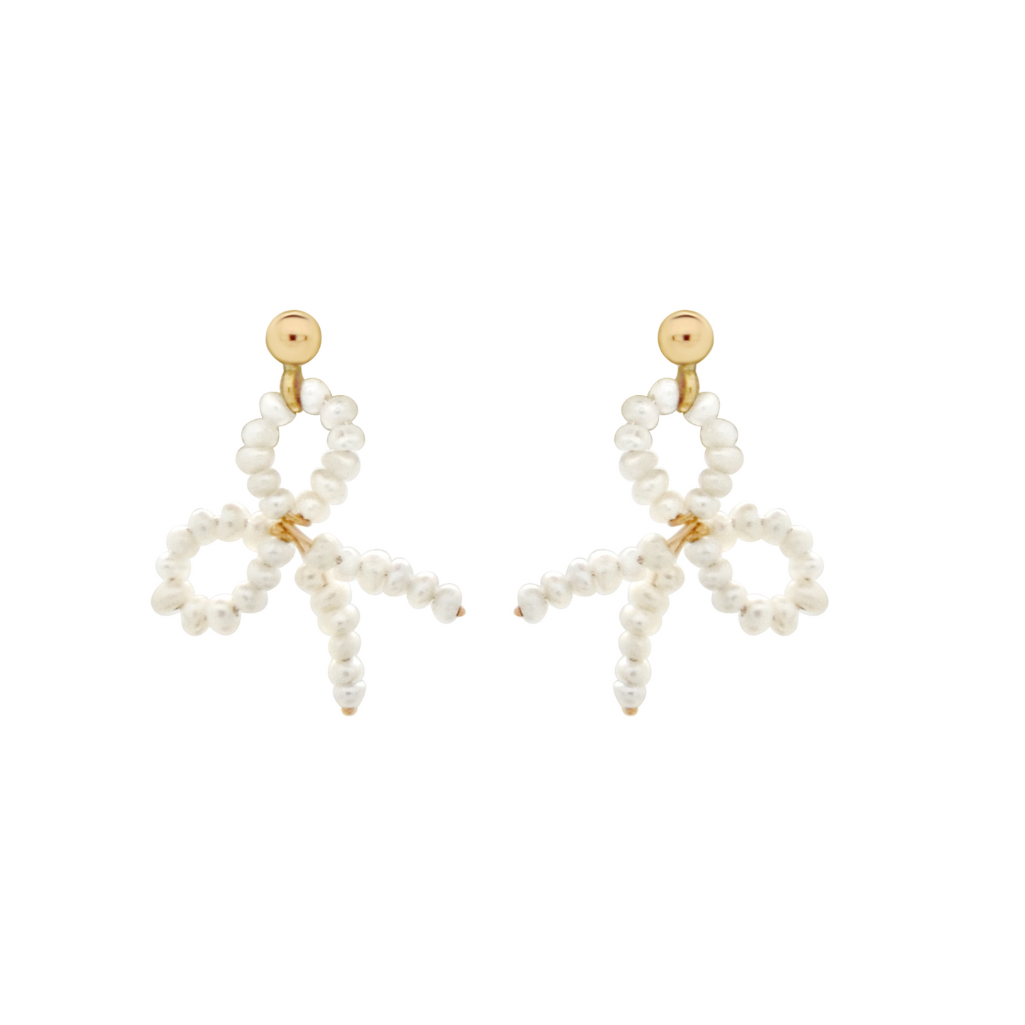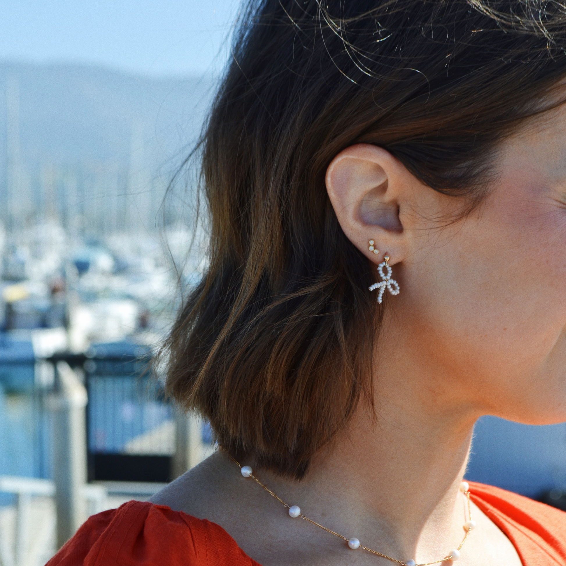 Small white pearls shaped into a perfect bow, hanging from a gold dot stud.
