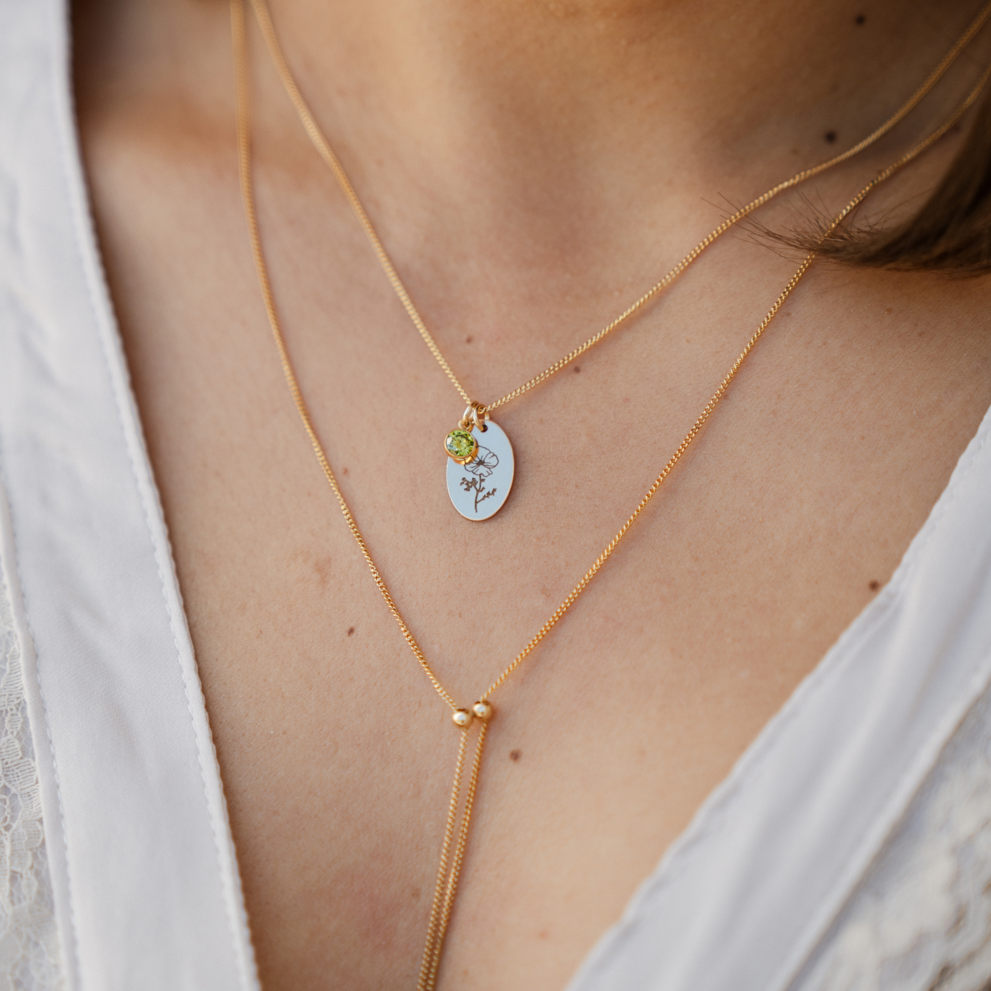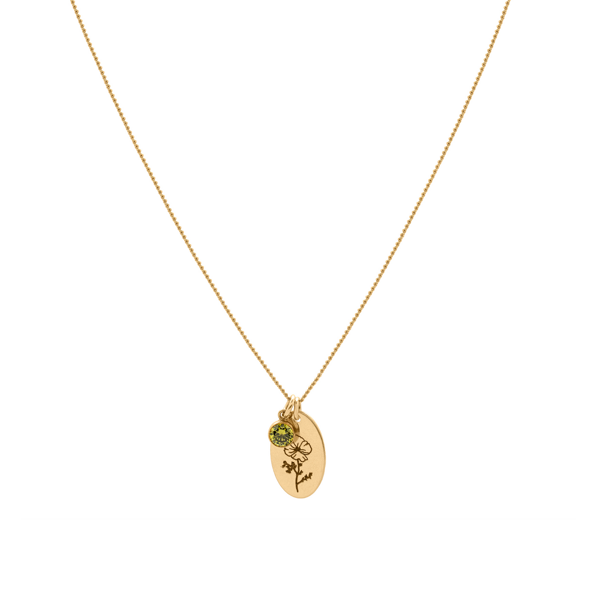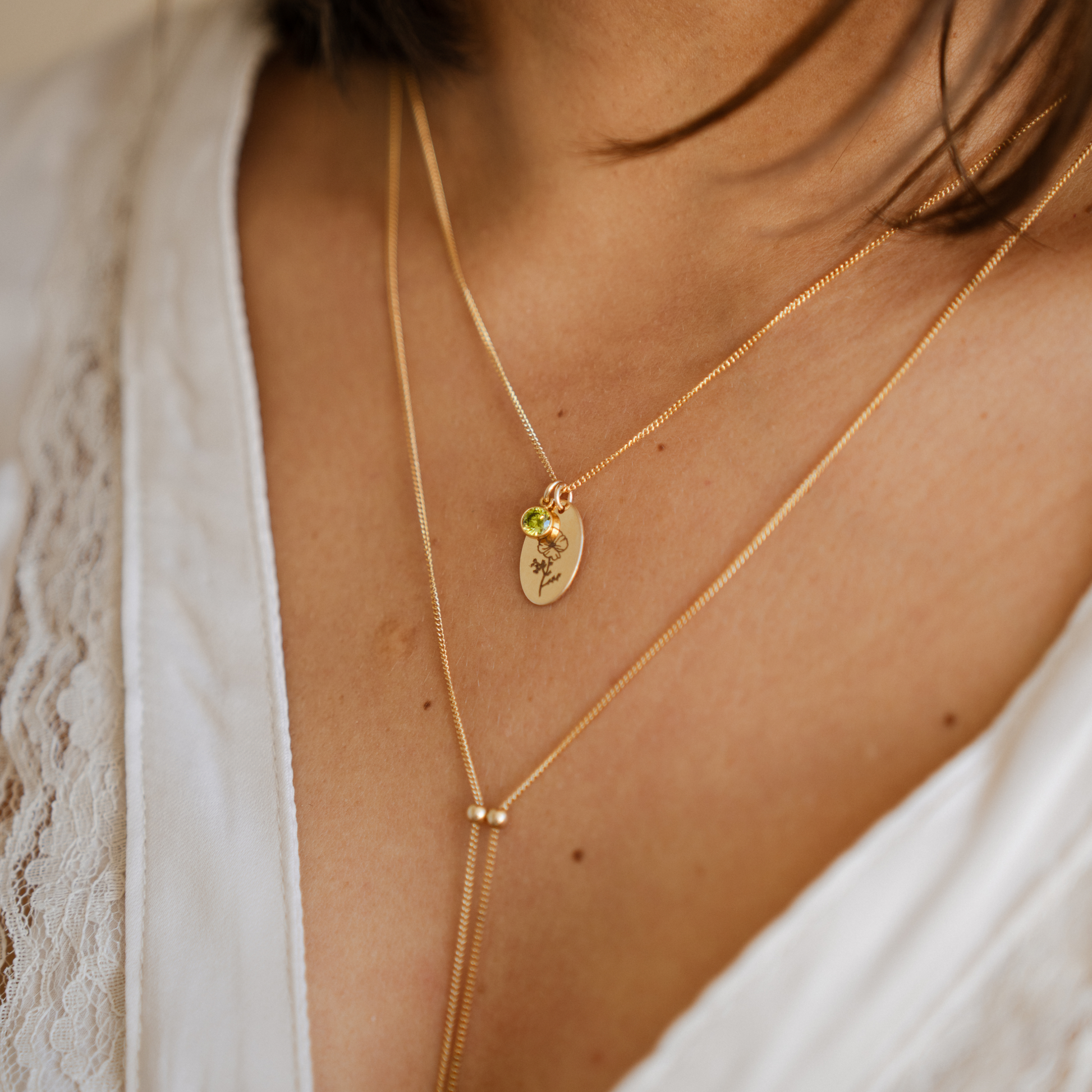 Wear your birth flower and birthstone proudly with our new necklace, featuring 12 unique blooms engraved on a classic oval, gold pendant. Illustrated by our team member Tahra!