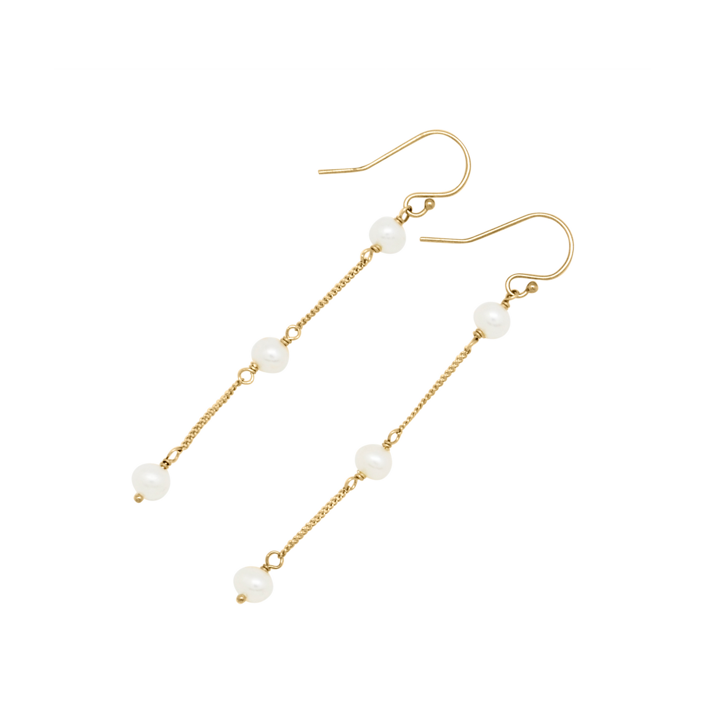 14k gold-filled curb chain with three dangling pearls wire-wrapped in succession.