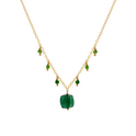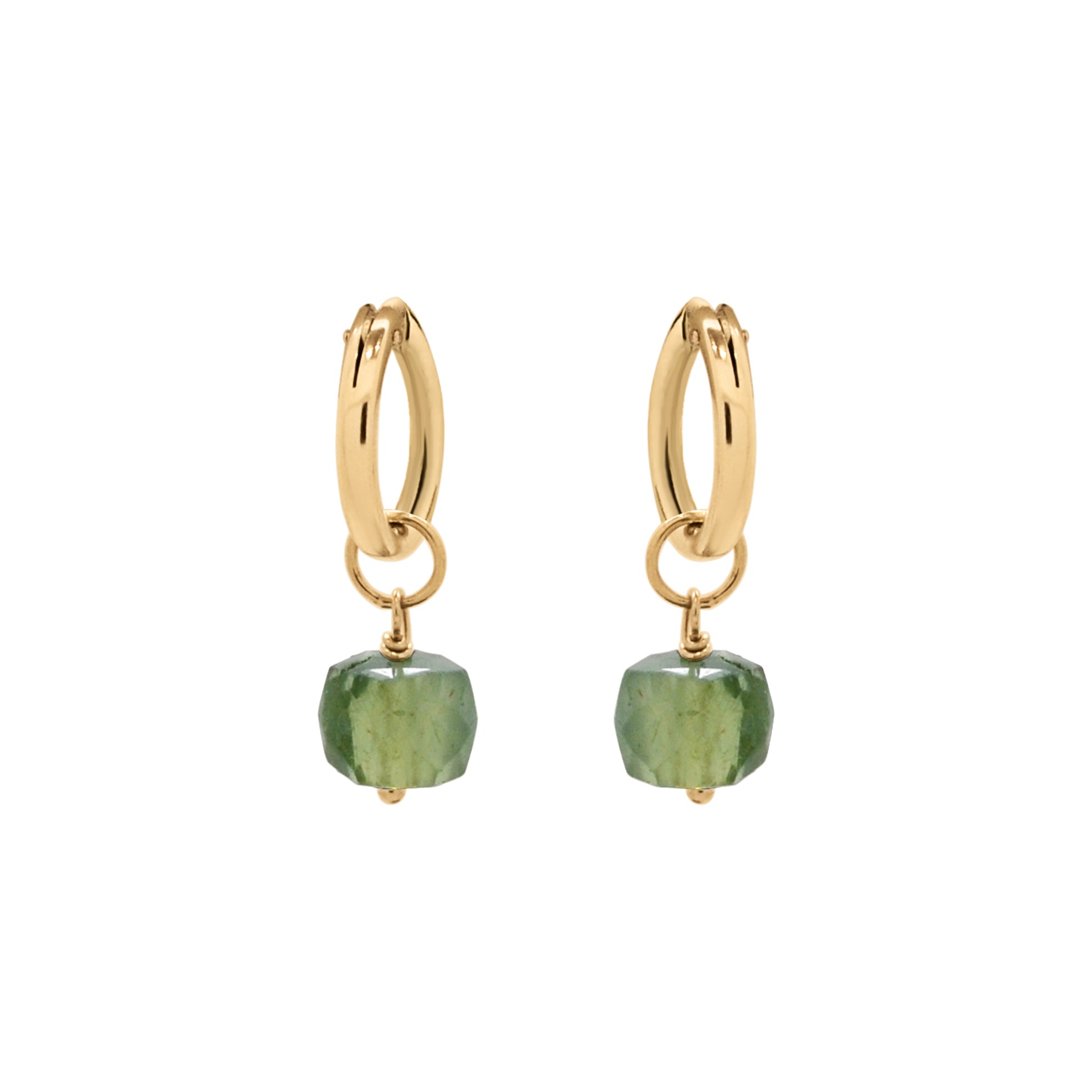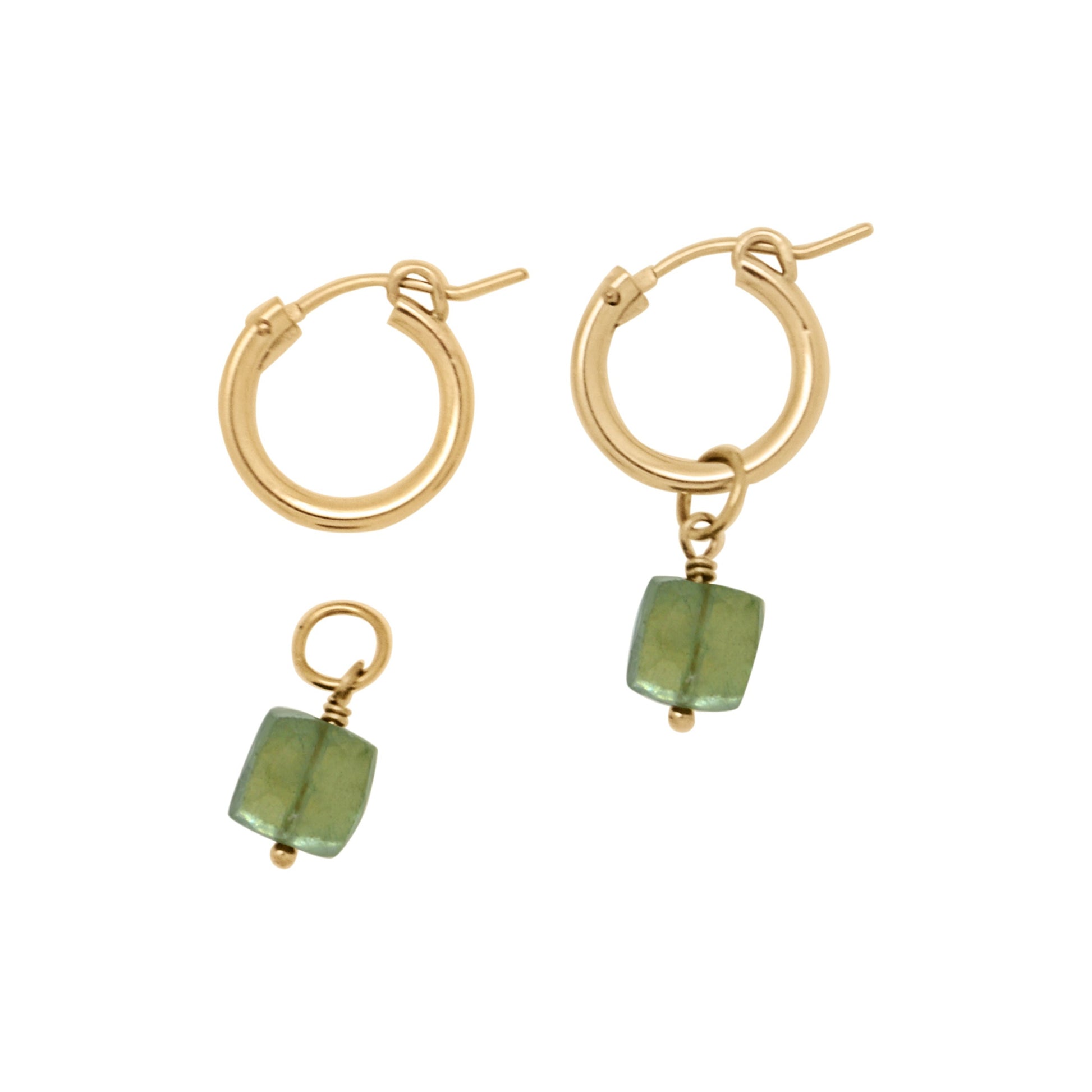 Set of small gold hoops with a removable dangling green Serpentine cube drops.