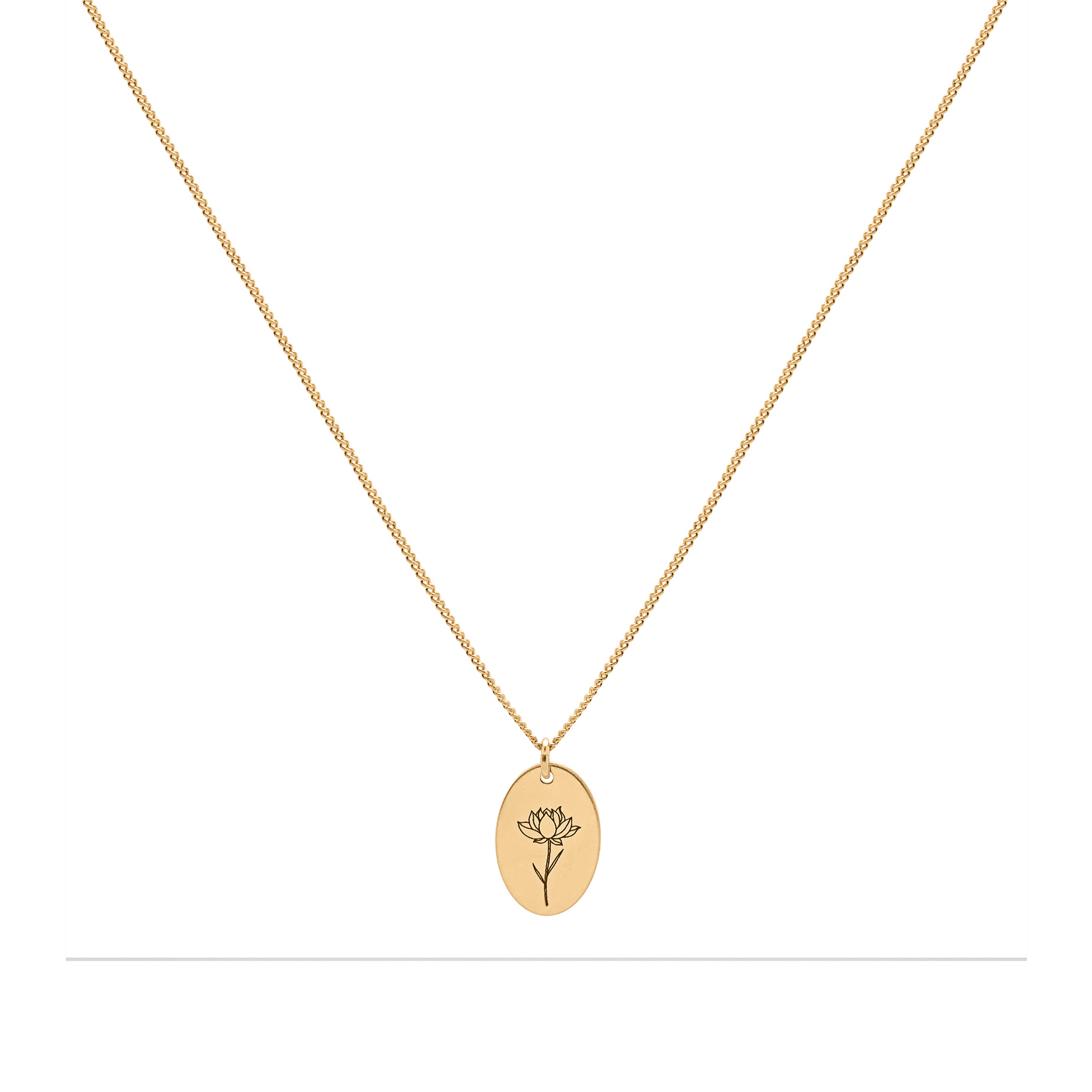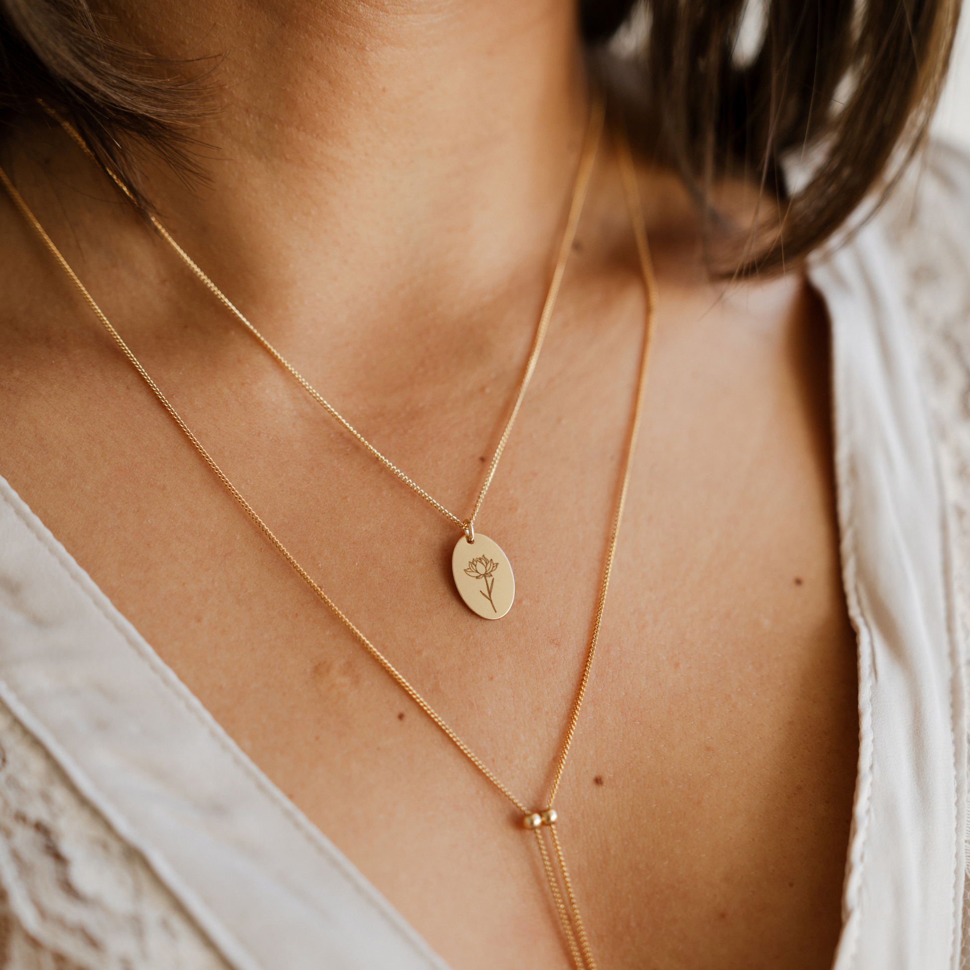 Wear your birth flower proudly with our new necklace, featuring 12 unique blooms engraved on a classic oval, gold pendant. Illustrated by our talented team member Tahra!