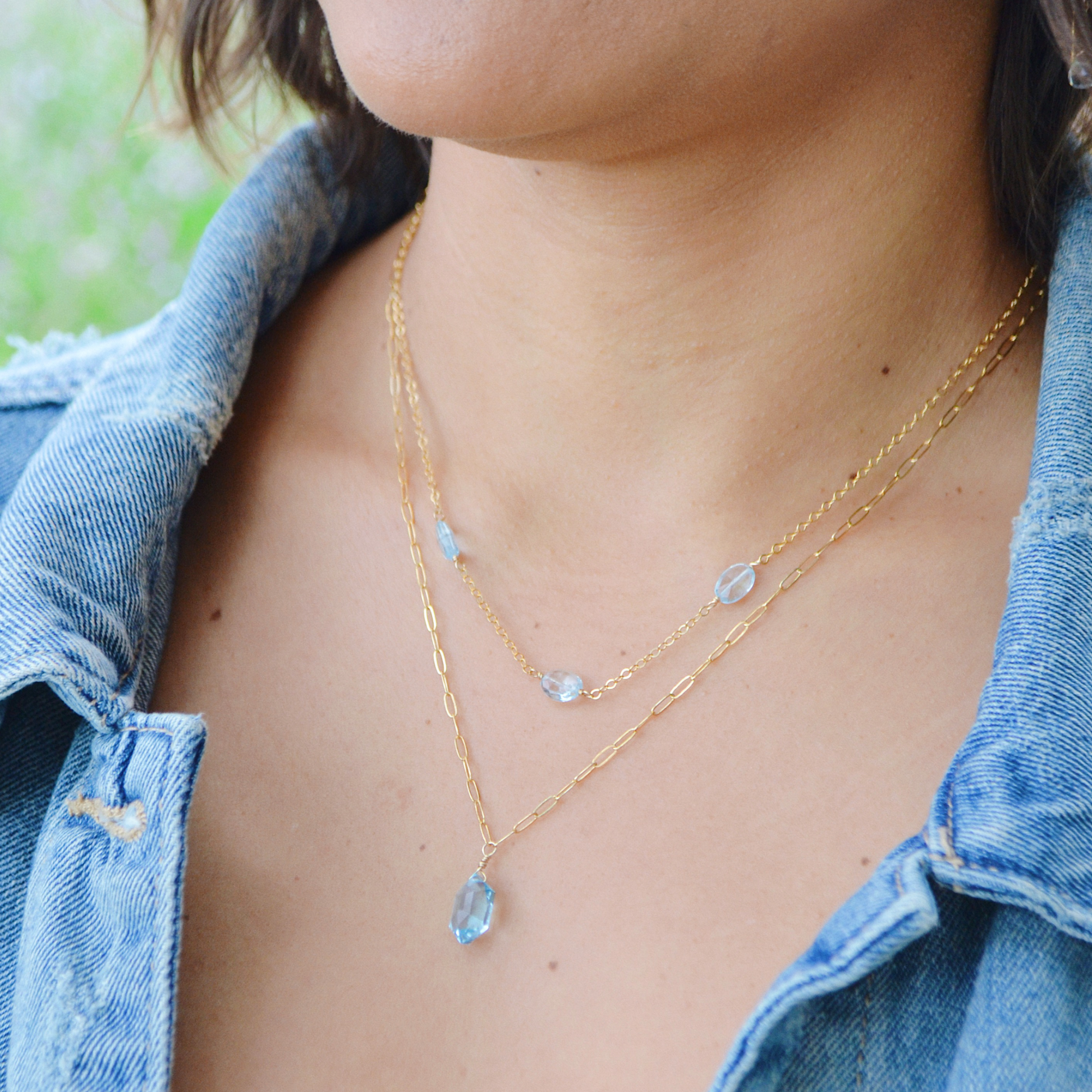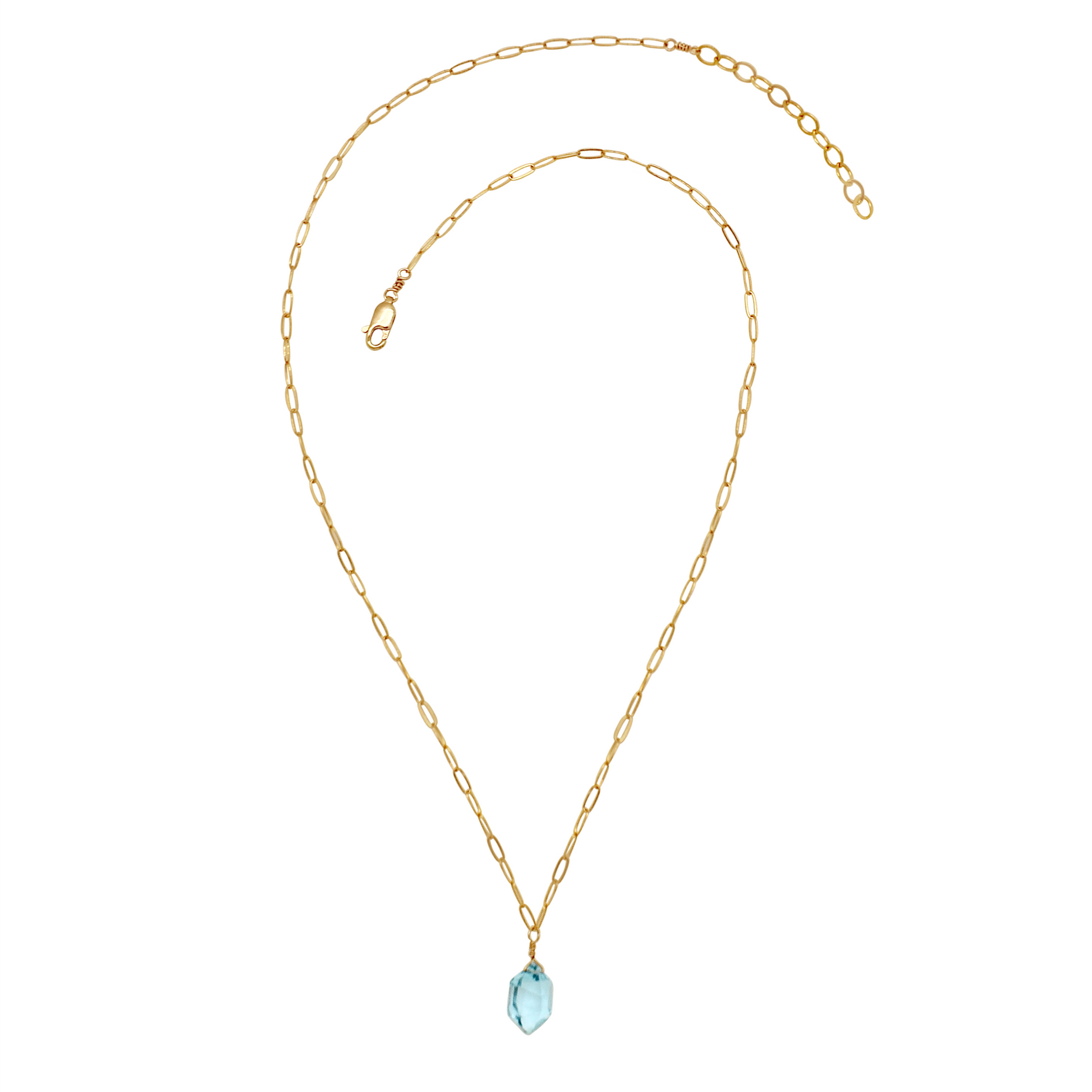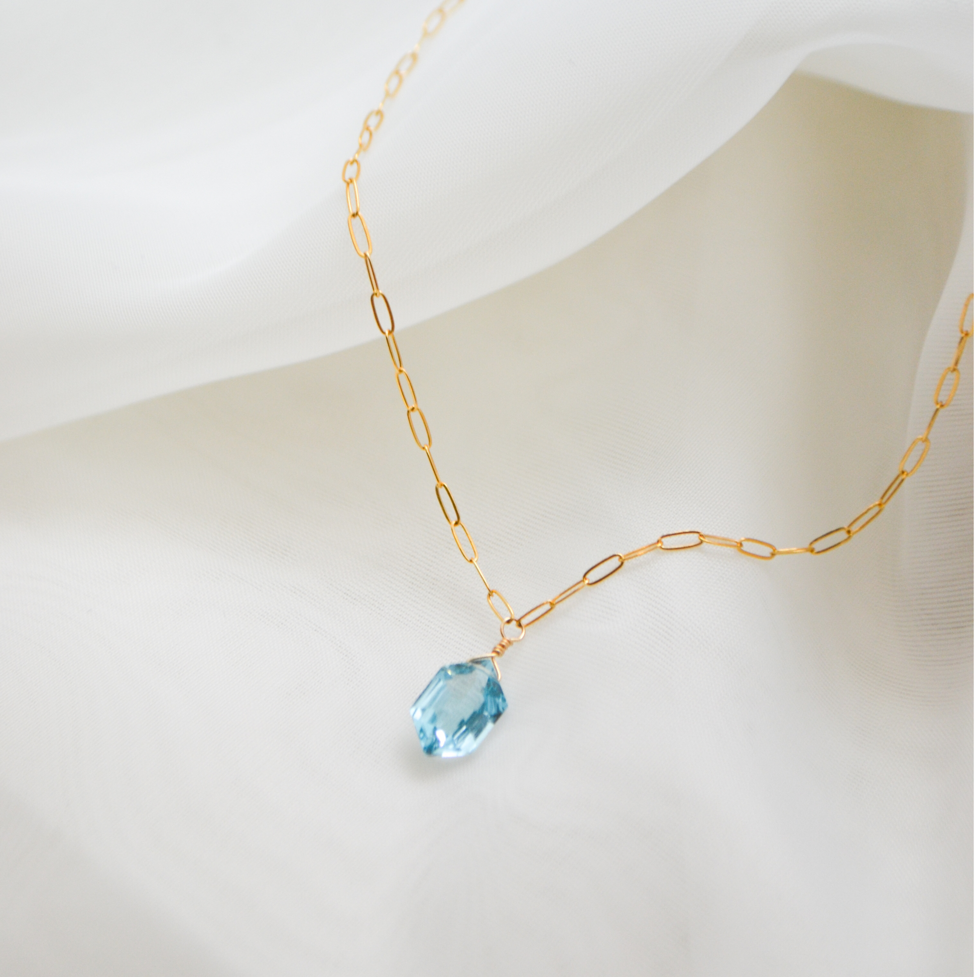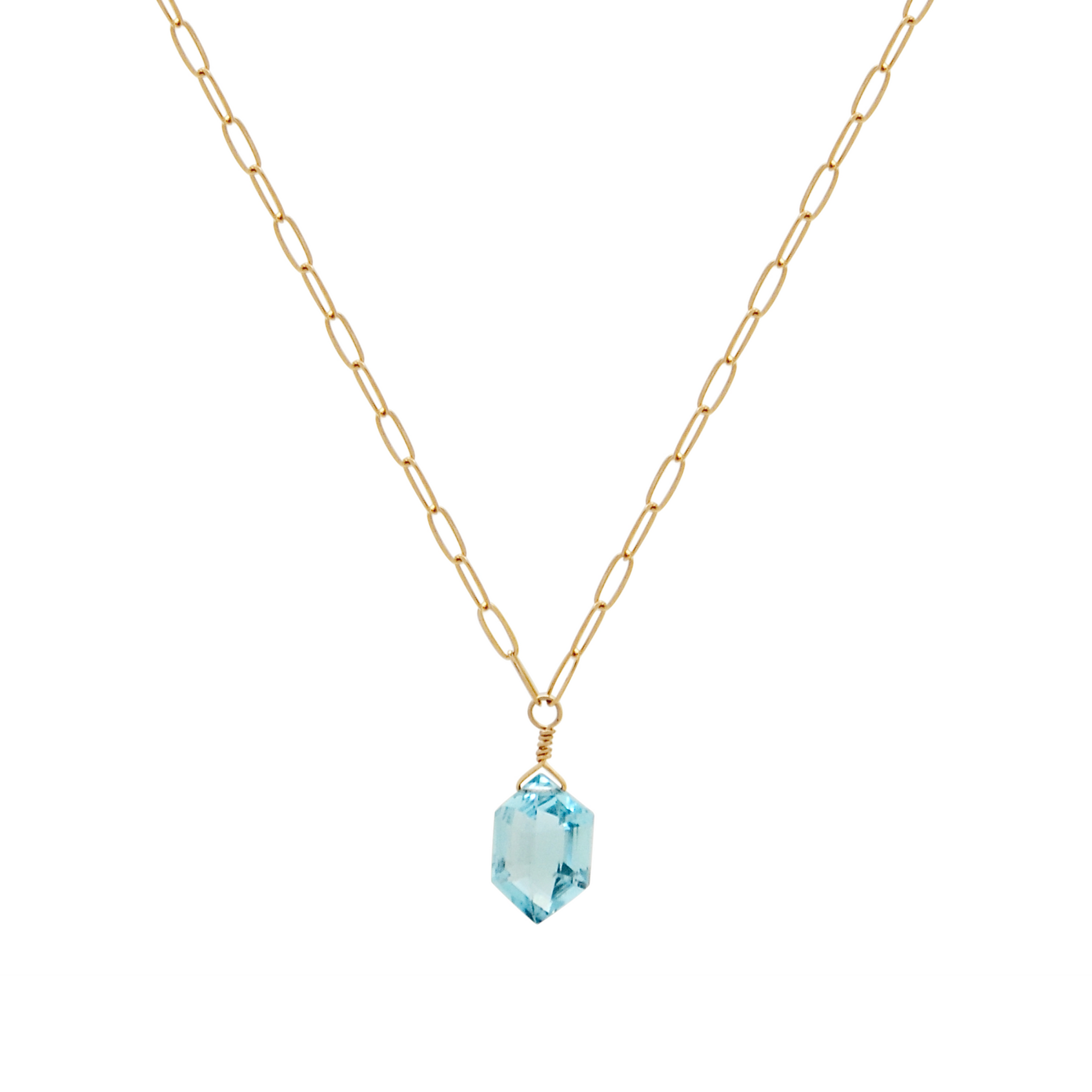 Gold-filled paperclip chain necklace wtih hexagonal blue topaz pendant.