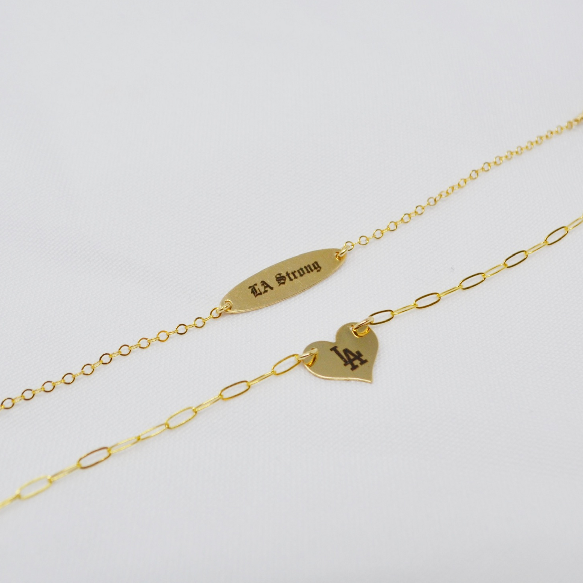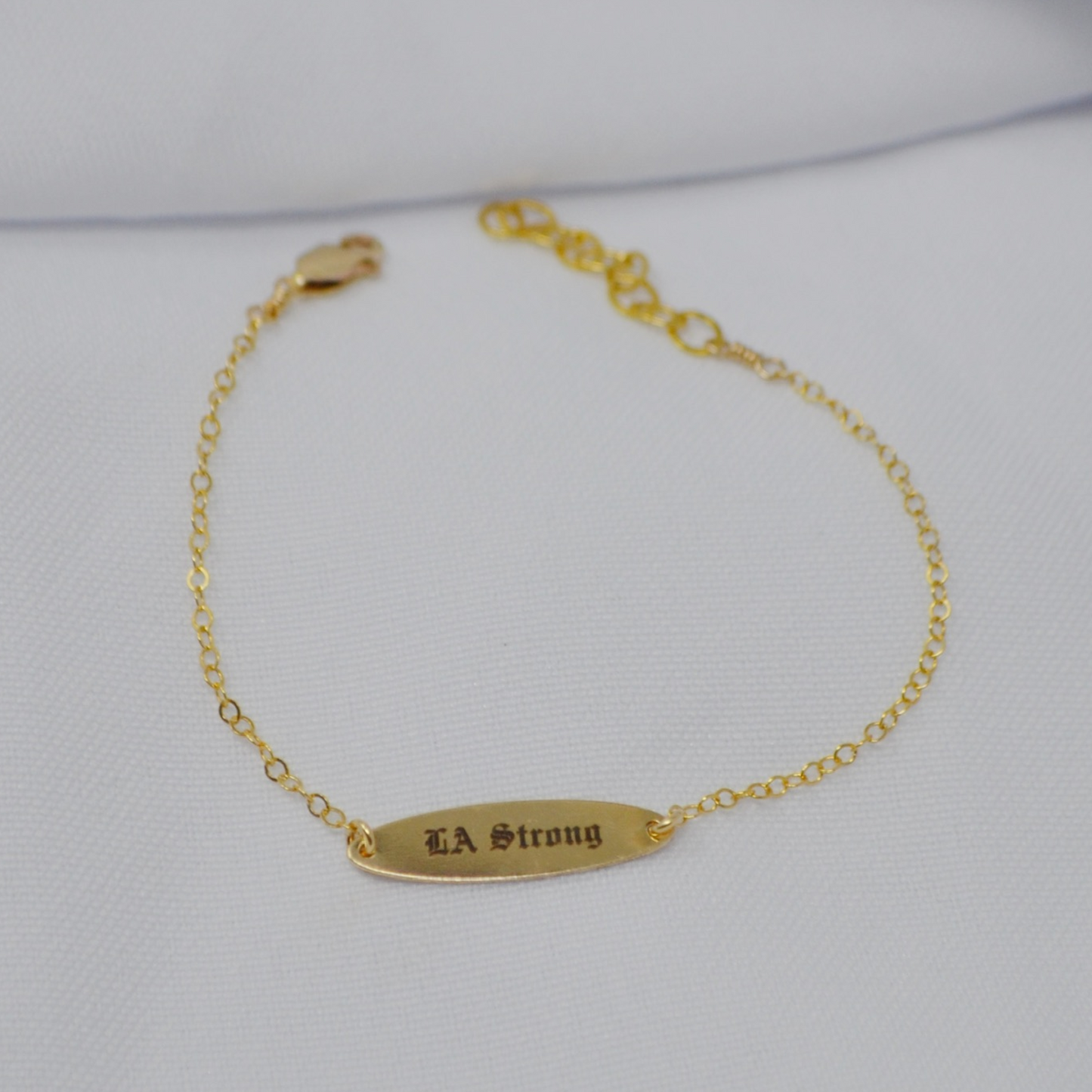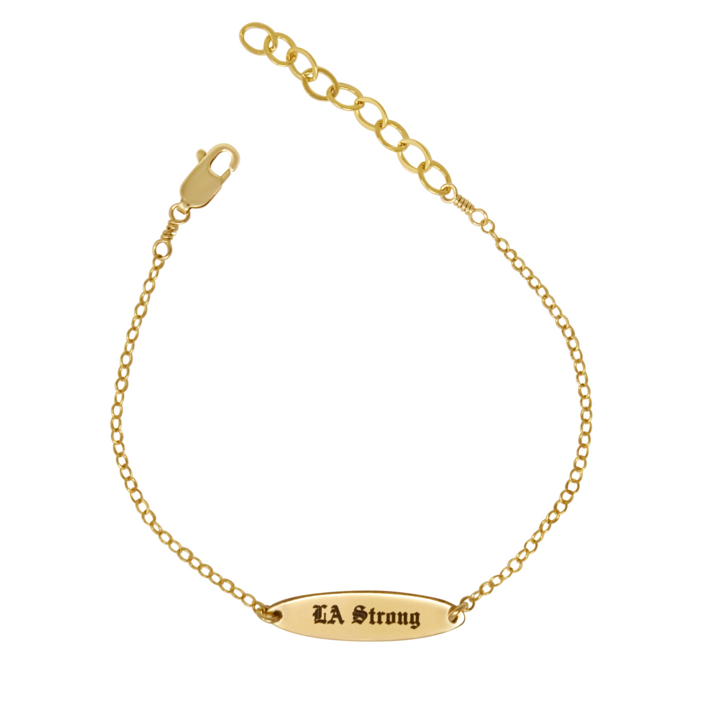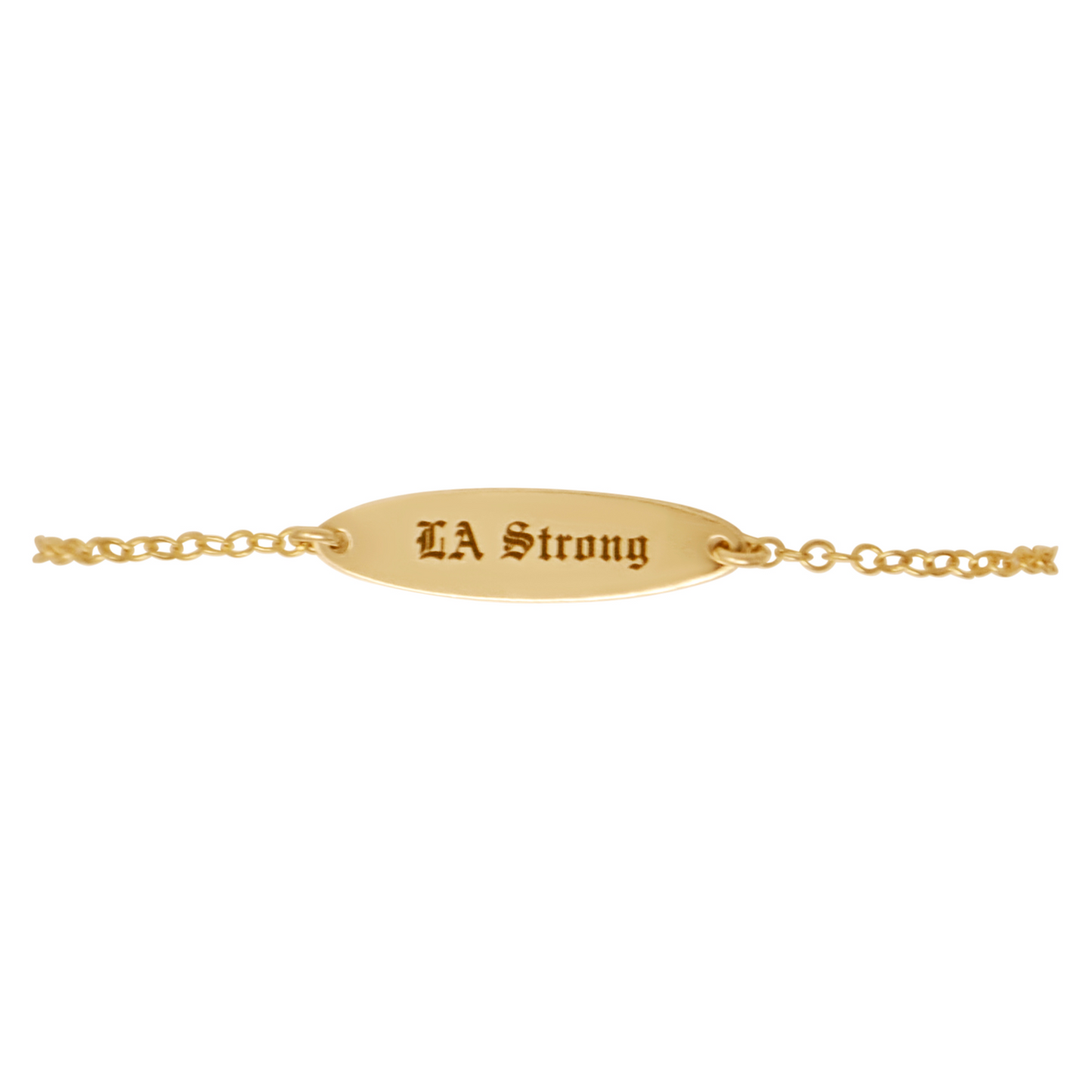 Dainty chain bracelet with LA Strong engraved on oval ID bar.