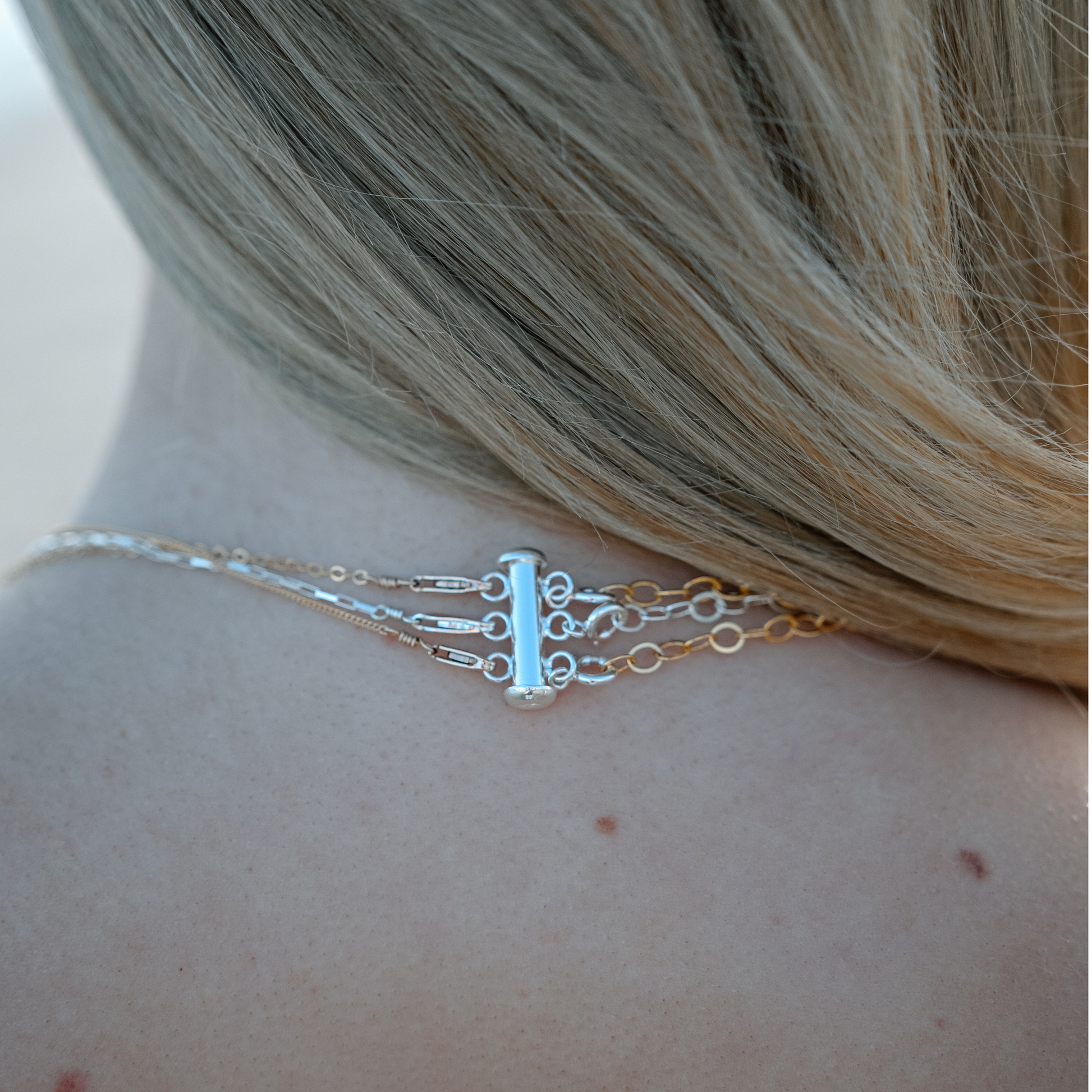 Want to layer your necklaces without them getting in a tangled mess? You found the perfect piece every jewelry lover needs. Layer up to 3 necklaces with this clasp. Just attach both ends of your necklace and voila no more chains twisting endlessly into each other. Just a beautiful layered necklace look!