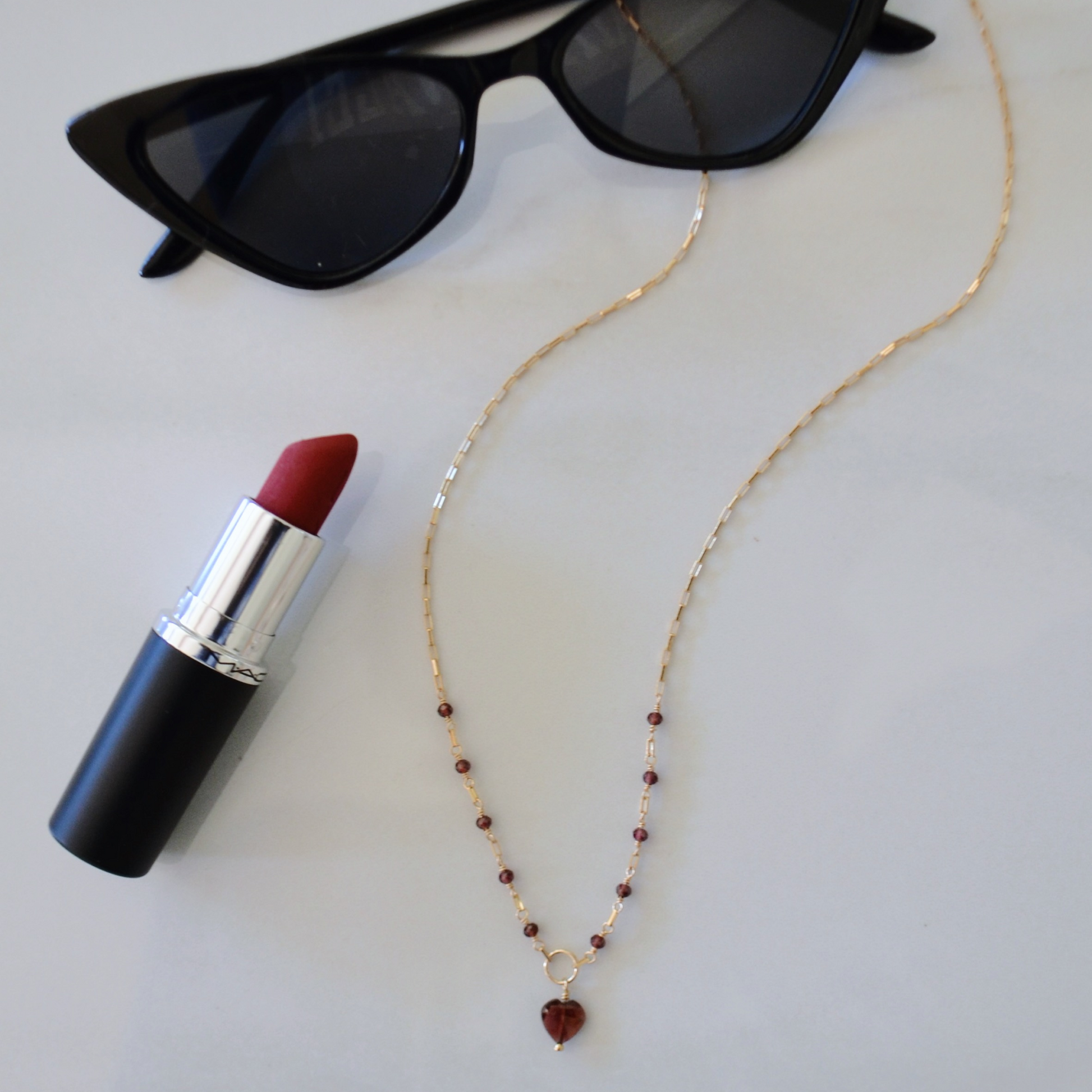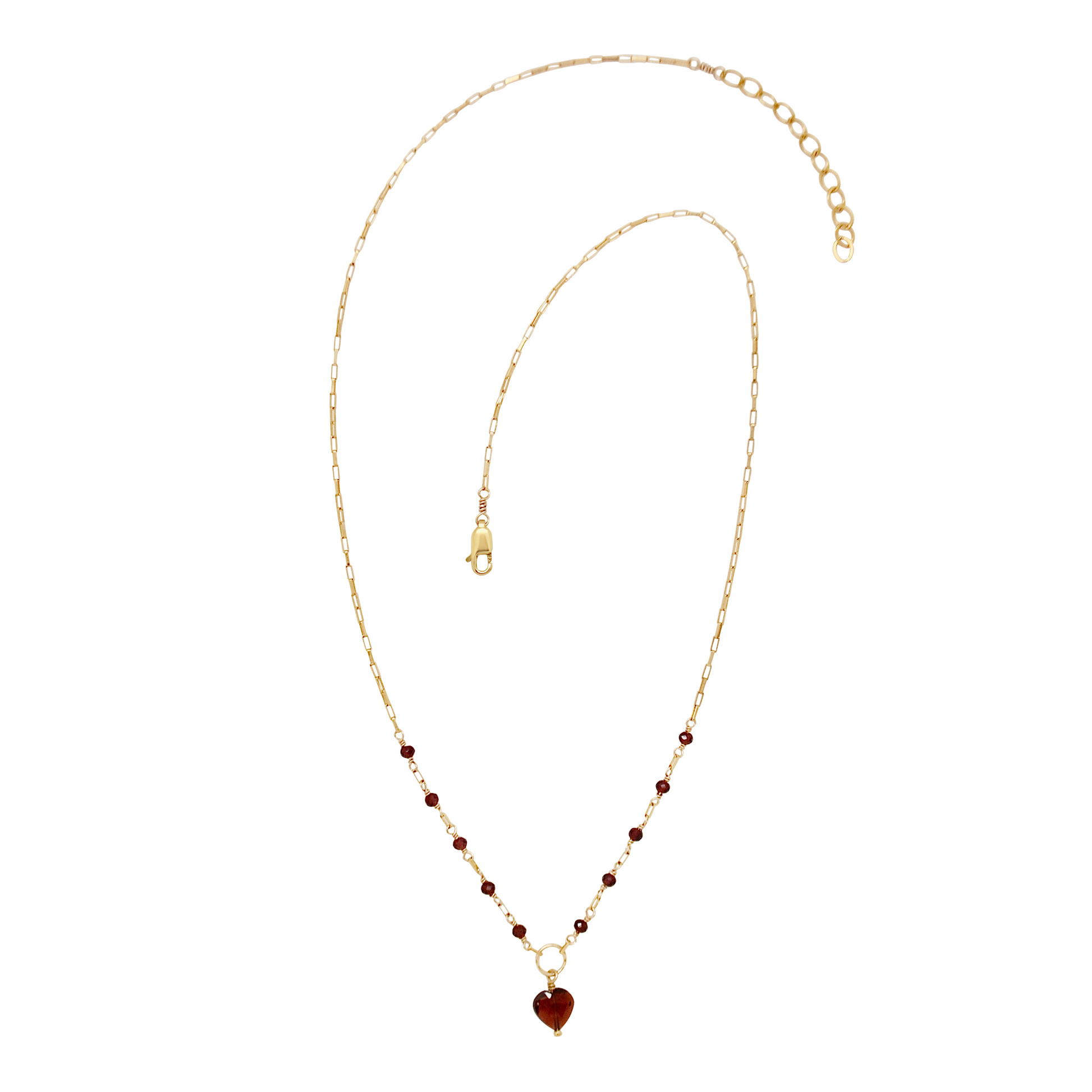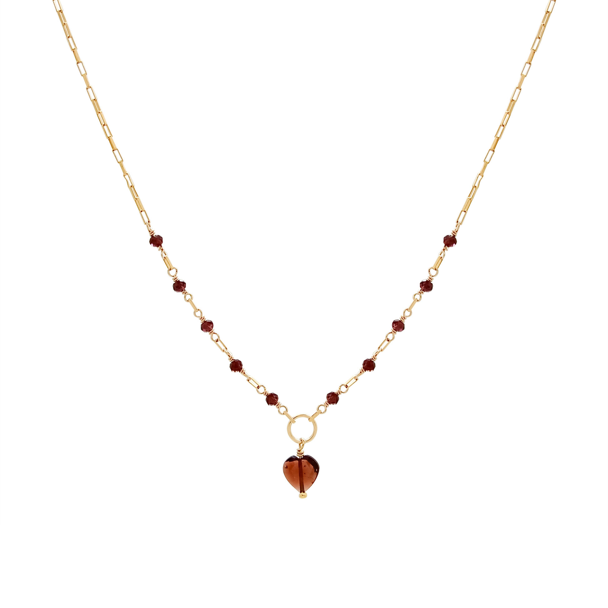 Venetian chain necklace with heart shaped garnet pendant and garnet gemstone accents.