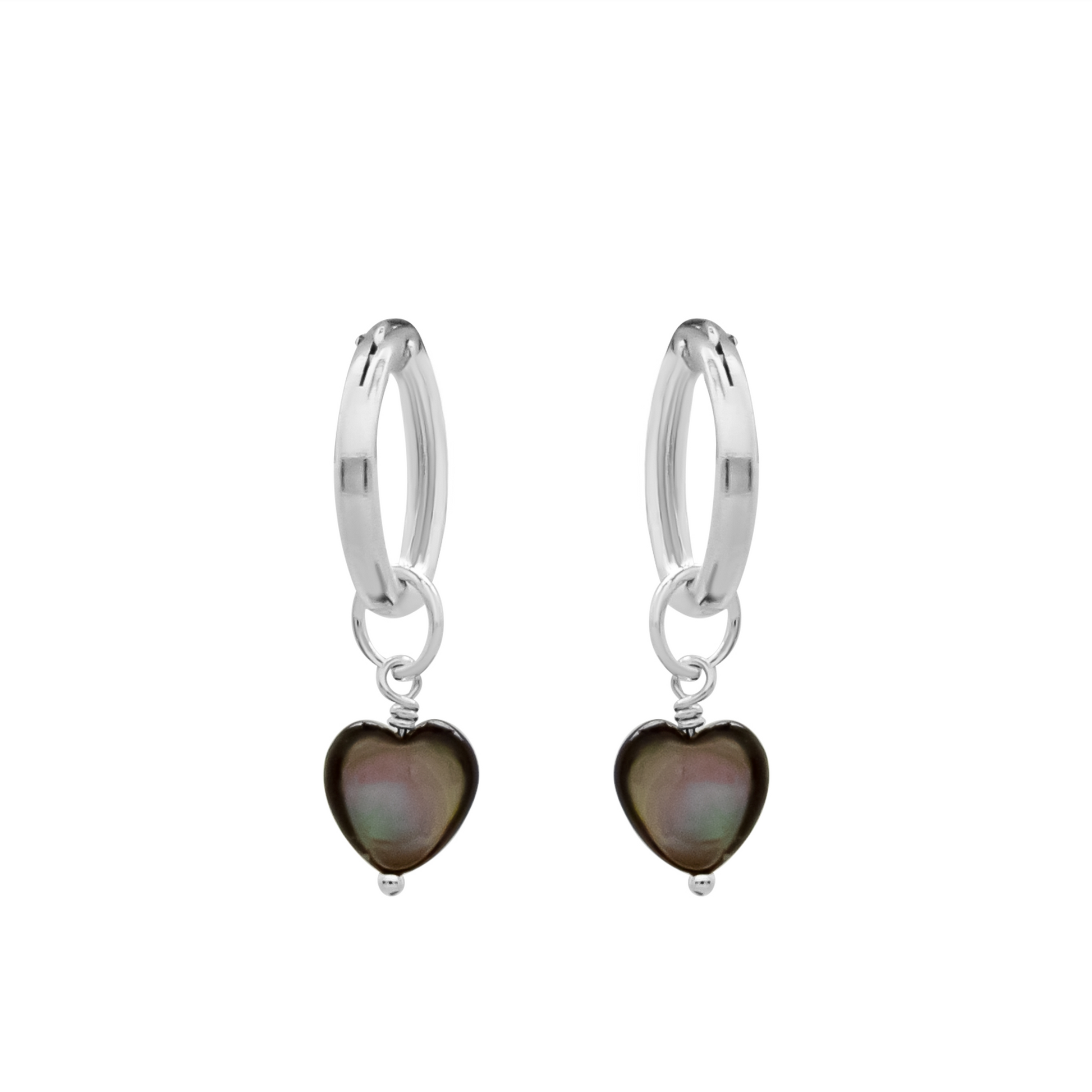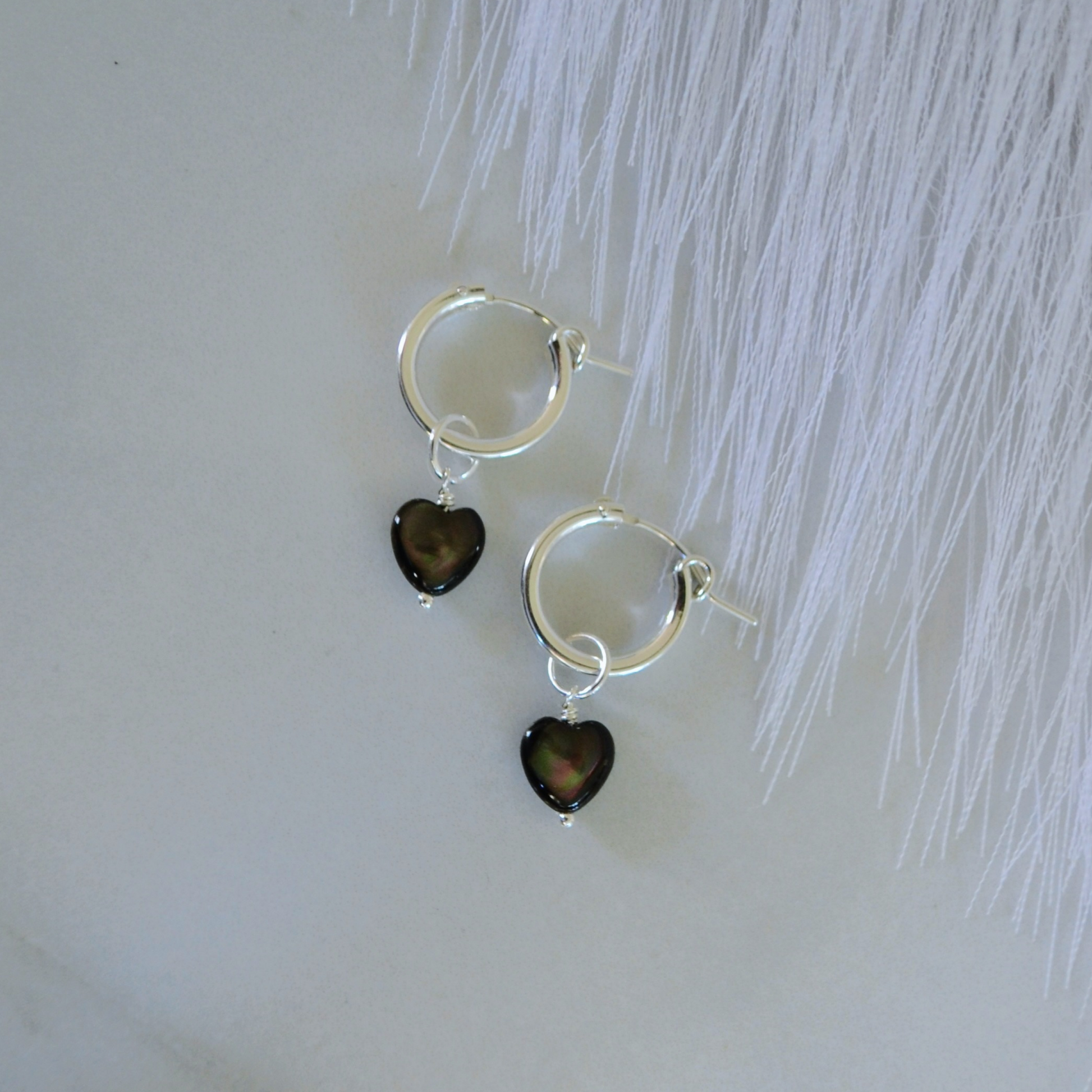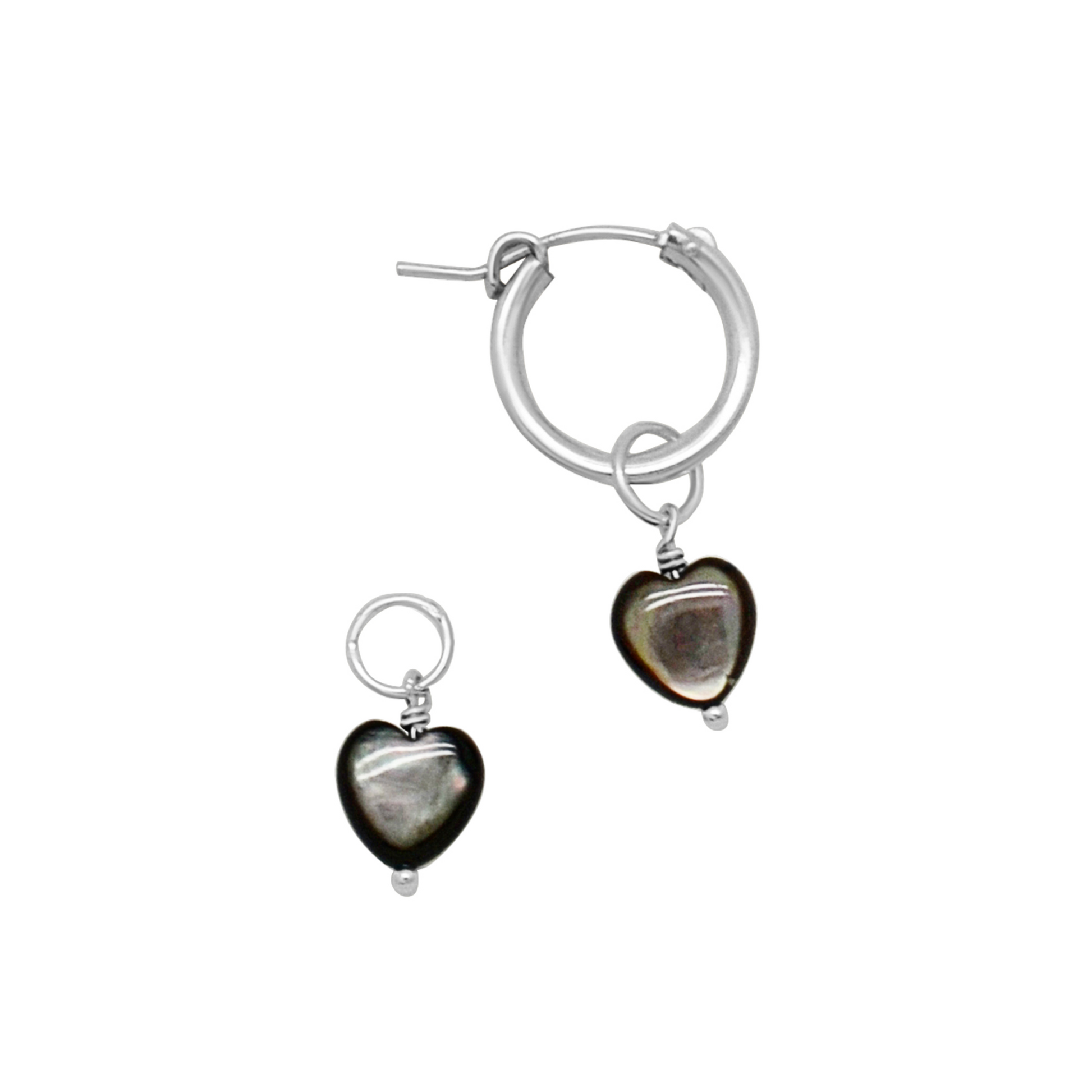 Set of small silver with removable dangling black mother of pearl heart shaped drops.