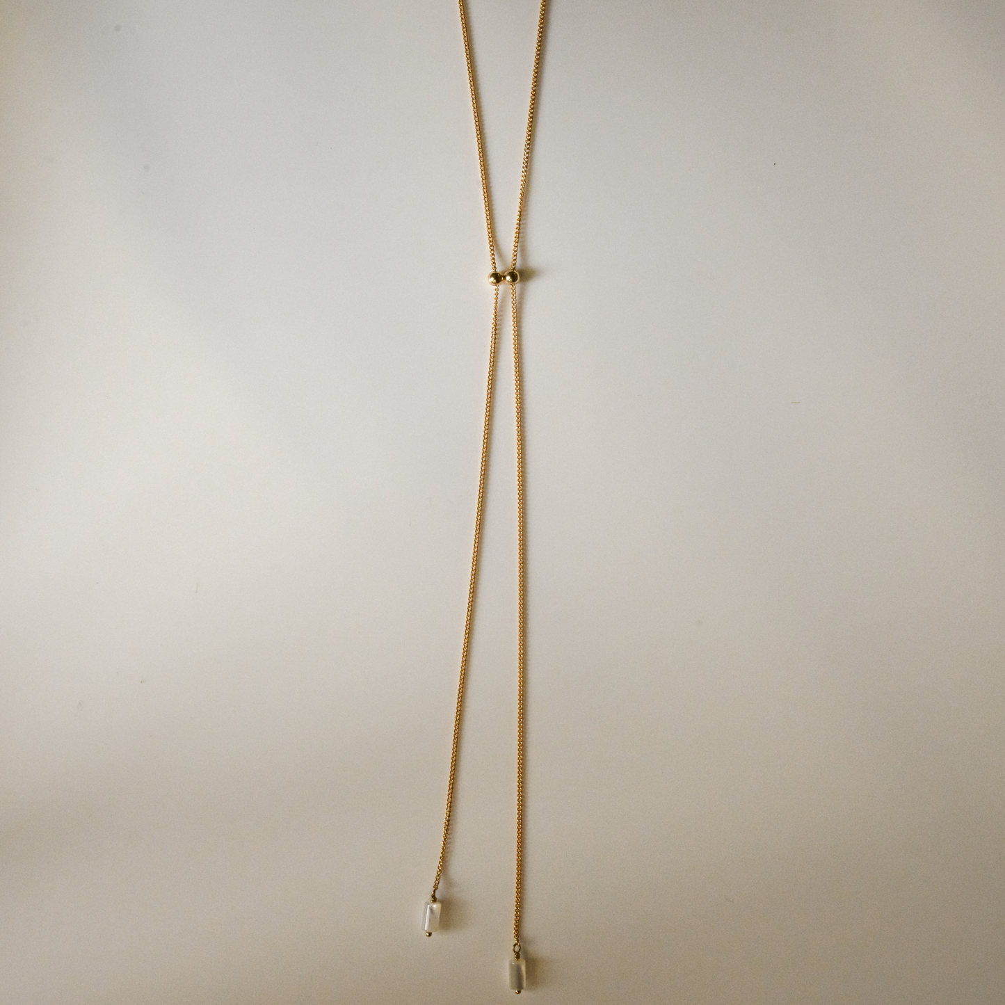Mini curb chain backlace necklace. Sliding bead allows for versatile neckline with white mother of pearl bead details.