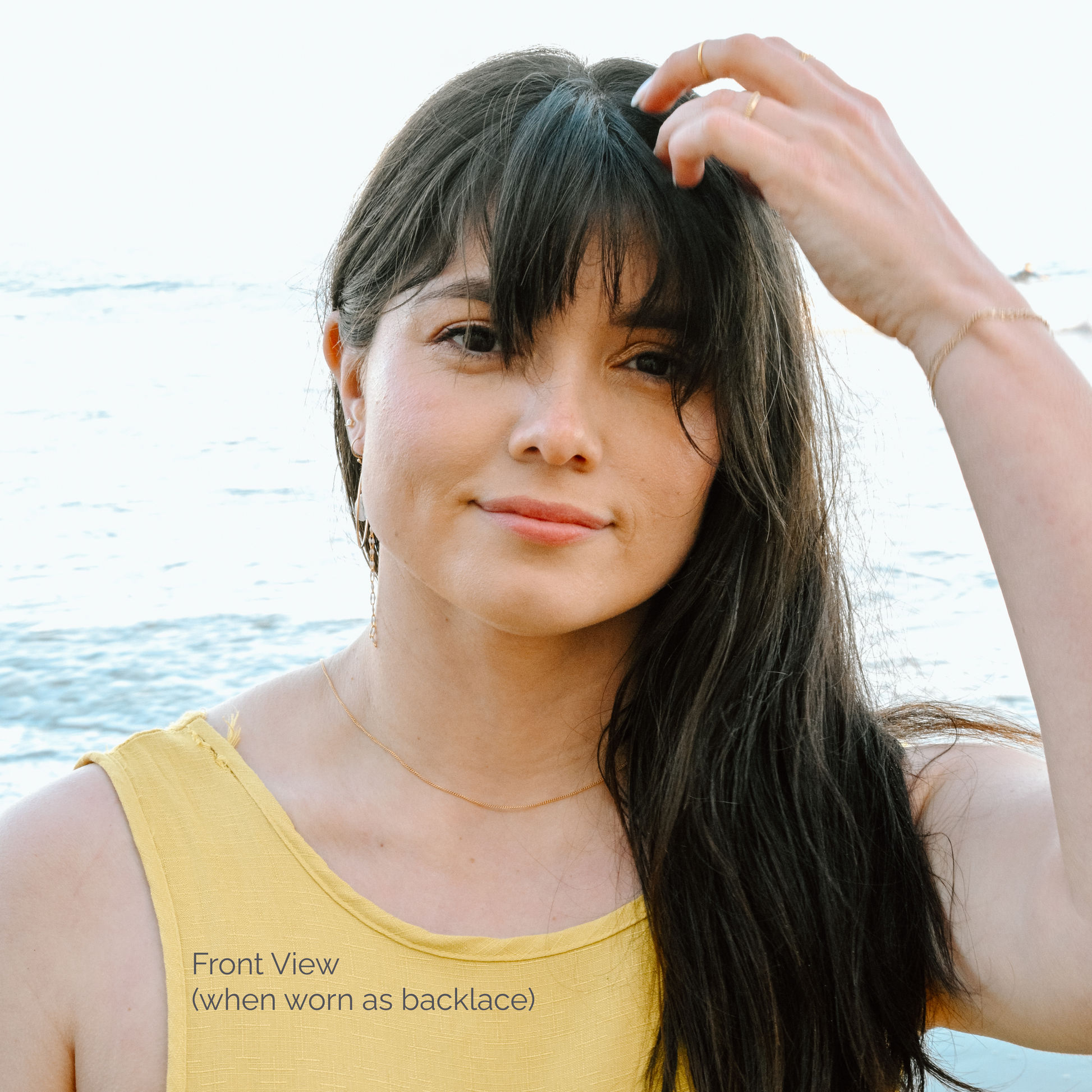Turn heads coming and going. The Mirage Backlace Necklace is the ultimate style chameleon—delicate, unique, and completely versatile. Designed with a sliding bead for an adjustable fit, it can be worn traditionally in front or flipped for a dramatic back-draping moment. Perfect for low-back dresses, bridal looks, or whenever you’re feeling a little extra. Luminous mother of pearl dangles catch the light with every step, while the clasp-free design slips easily over your head—no fumbling required. Limited edition, endlessly dreamy.