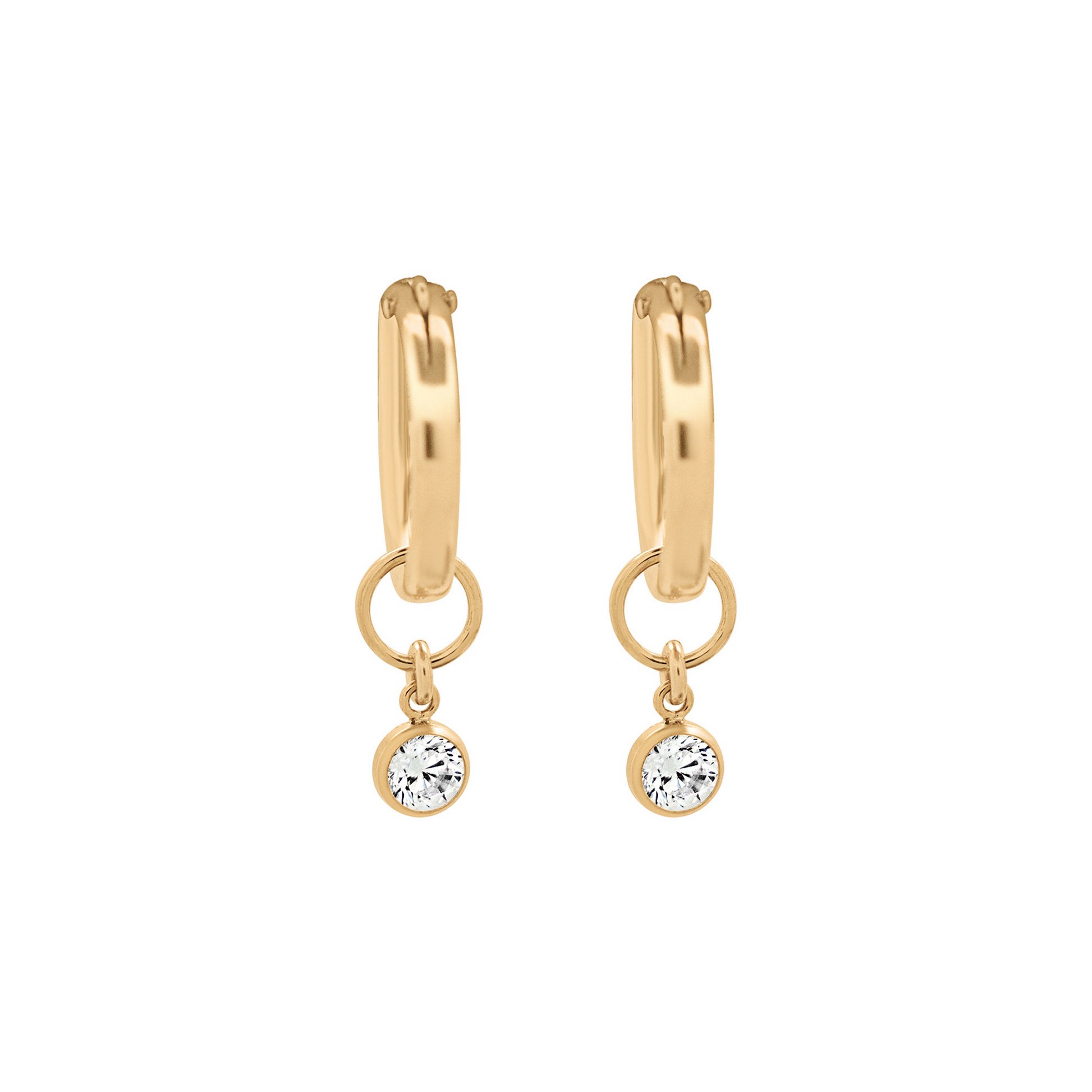 Set of small gold hoops with a removable dangling bezel set cubic zirconia stones.