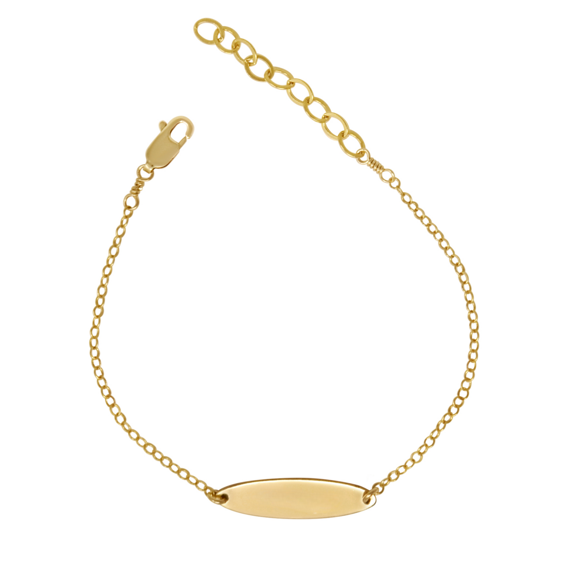 Dainty glimmer chain bracelet with an engravable oval ID bar.