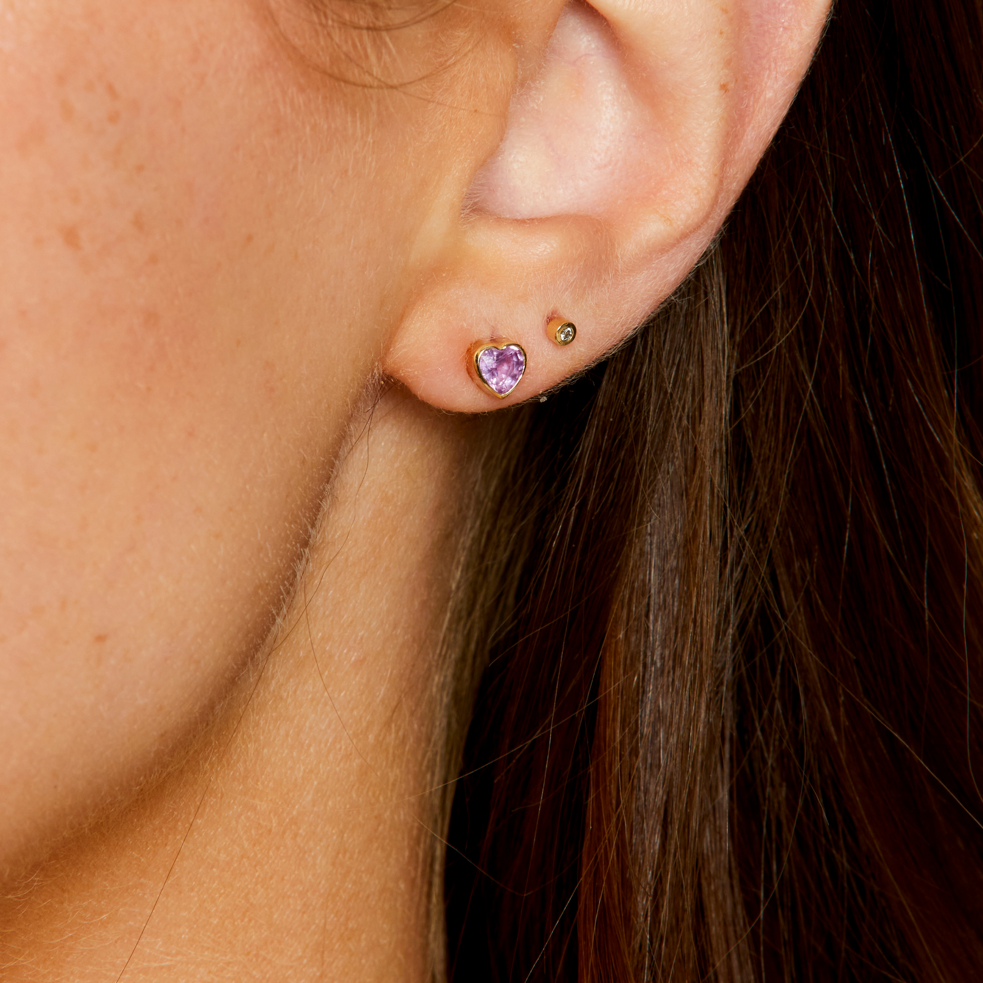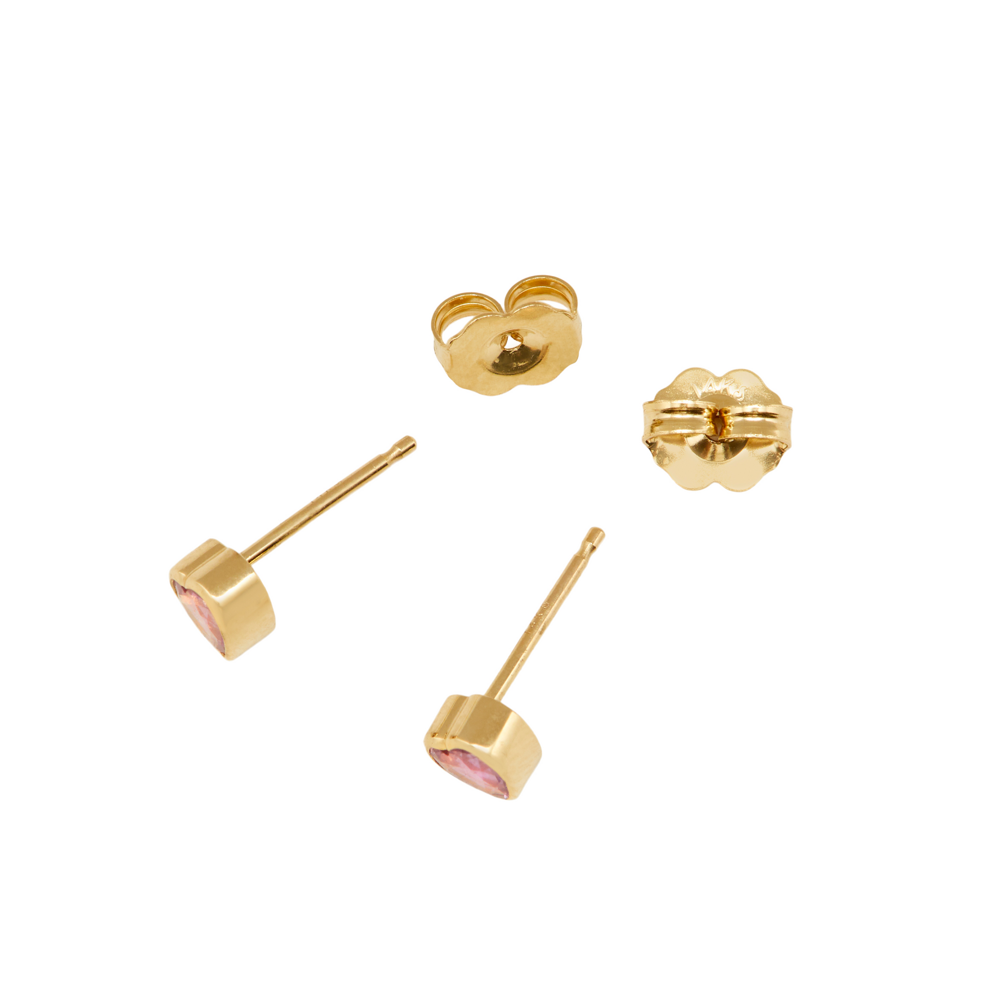 Pink Sapphire bezel set heart-shaped stud earrings.