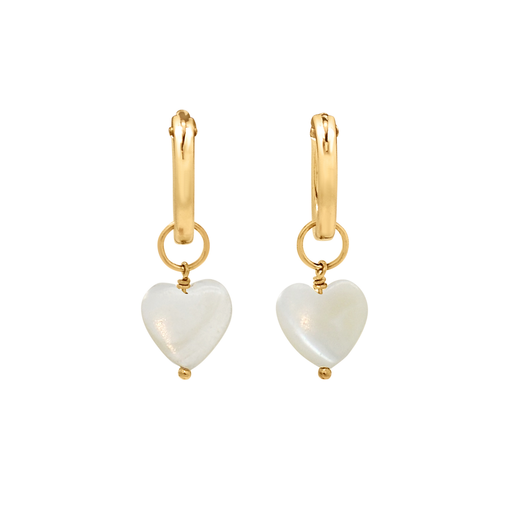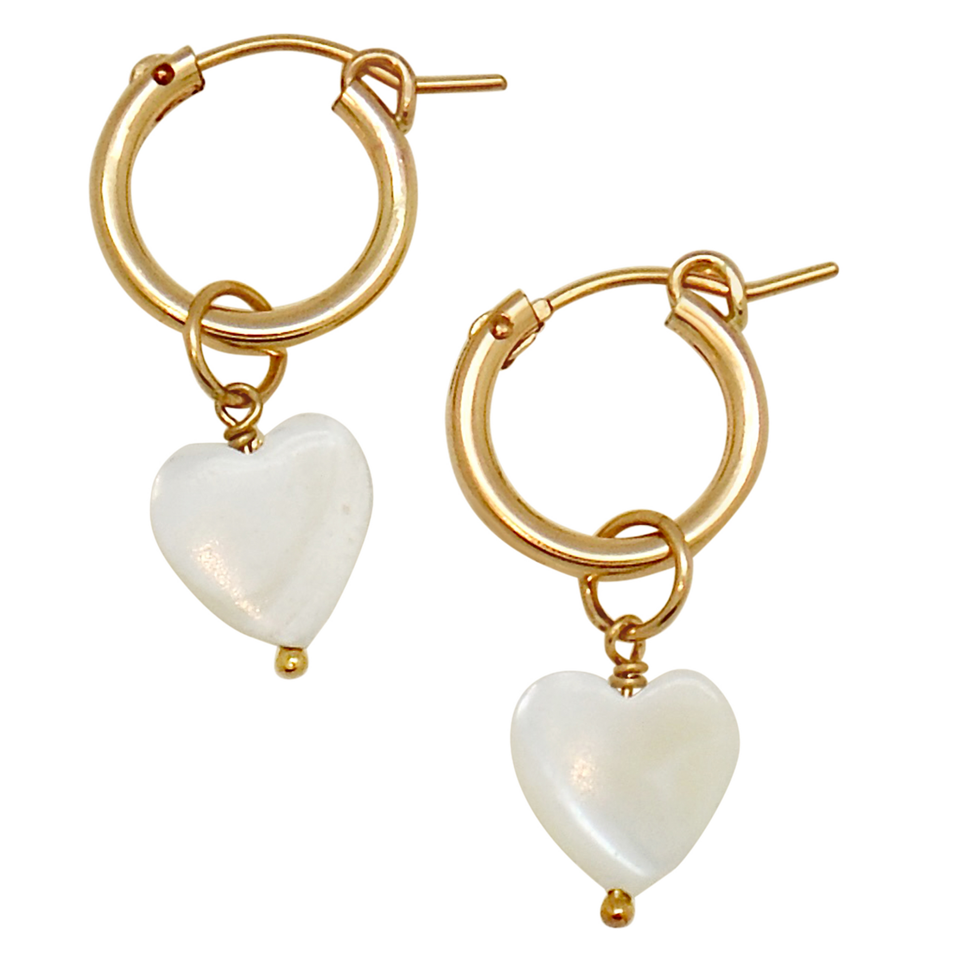 Set of small gold hoops with a removable dangling Mother of Pearl heart drops.
