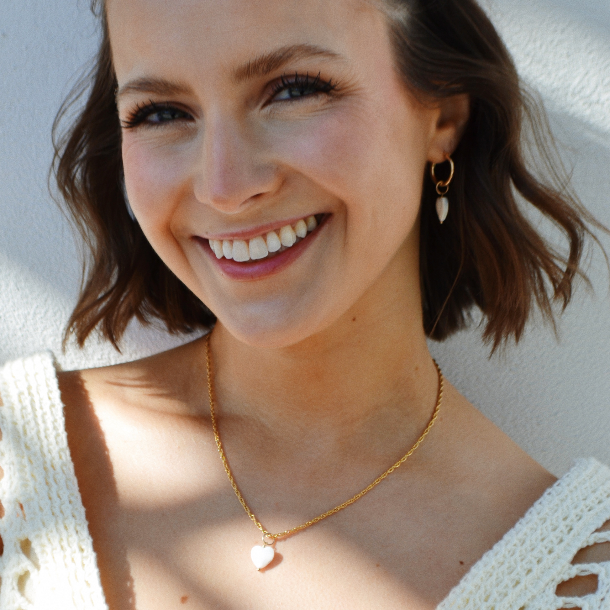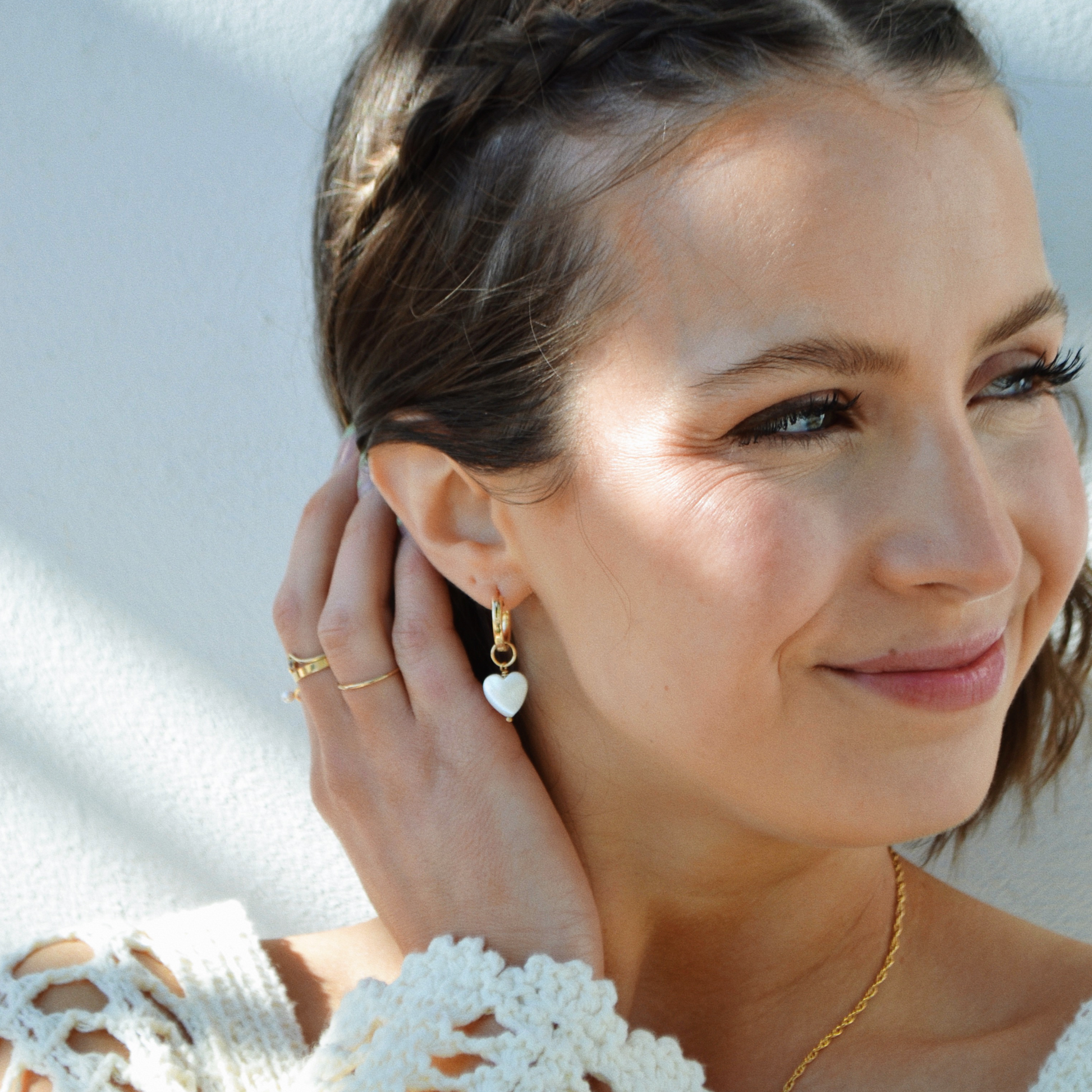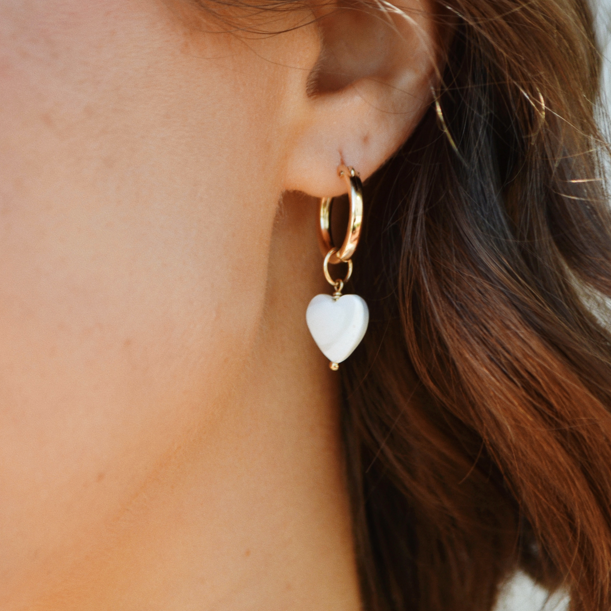 A hoops must-have, these gorgeous gemstone-drop hoop earrings feature almost iridescent, hanging heart-shaped Mother of Pearls. Chic, versatile, and luxuriuos these earrings will take you from a casual brunch to a romantic night out effortlessly. A staple set for any wardrobe.