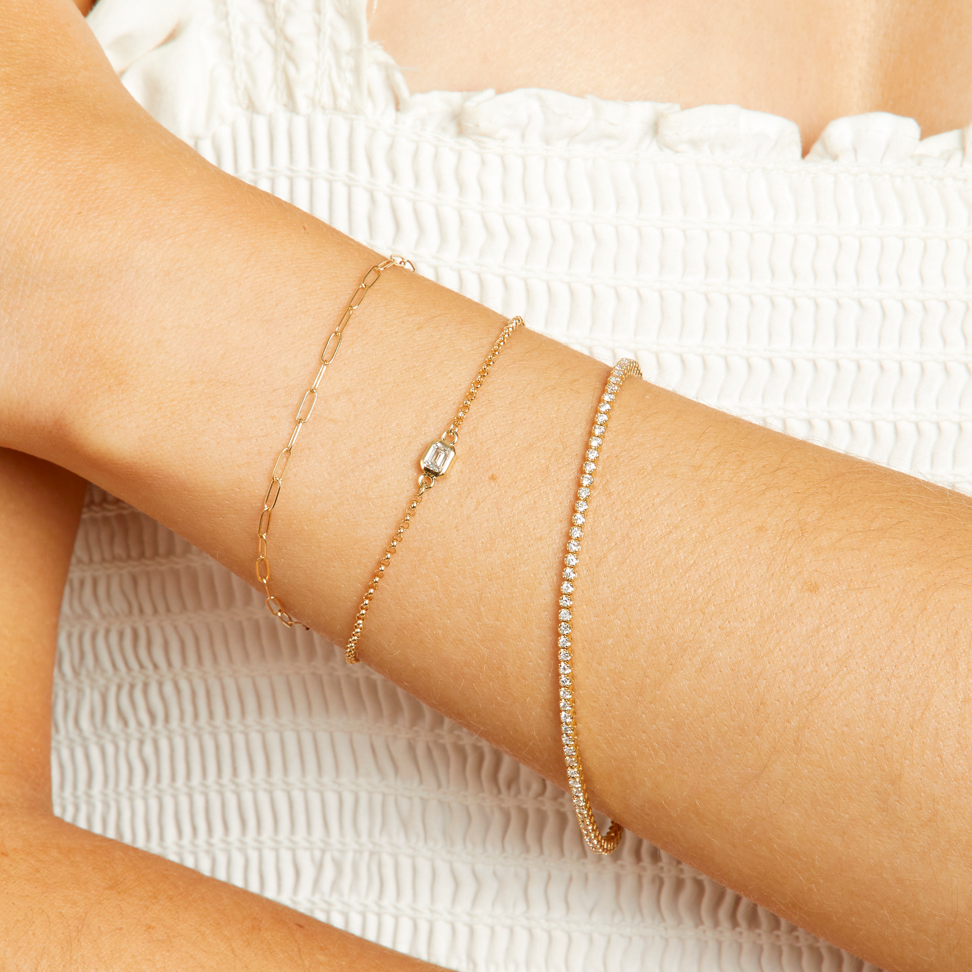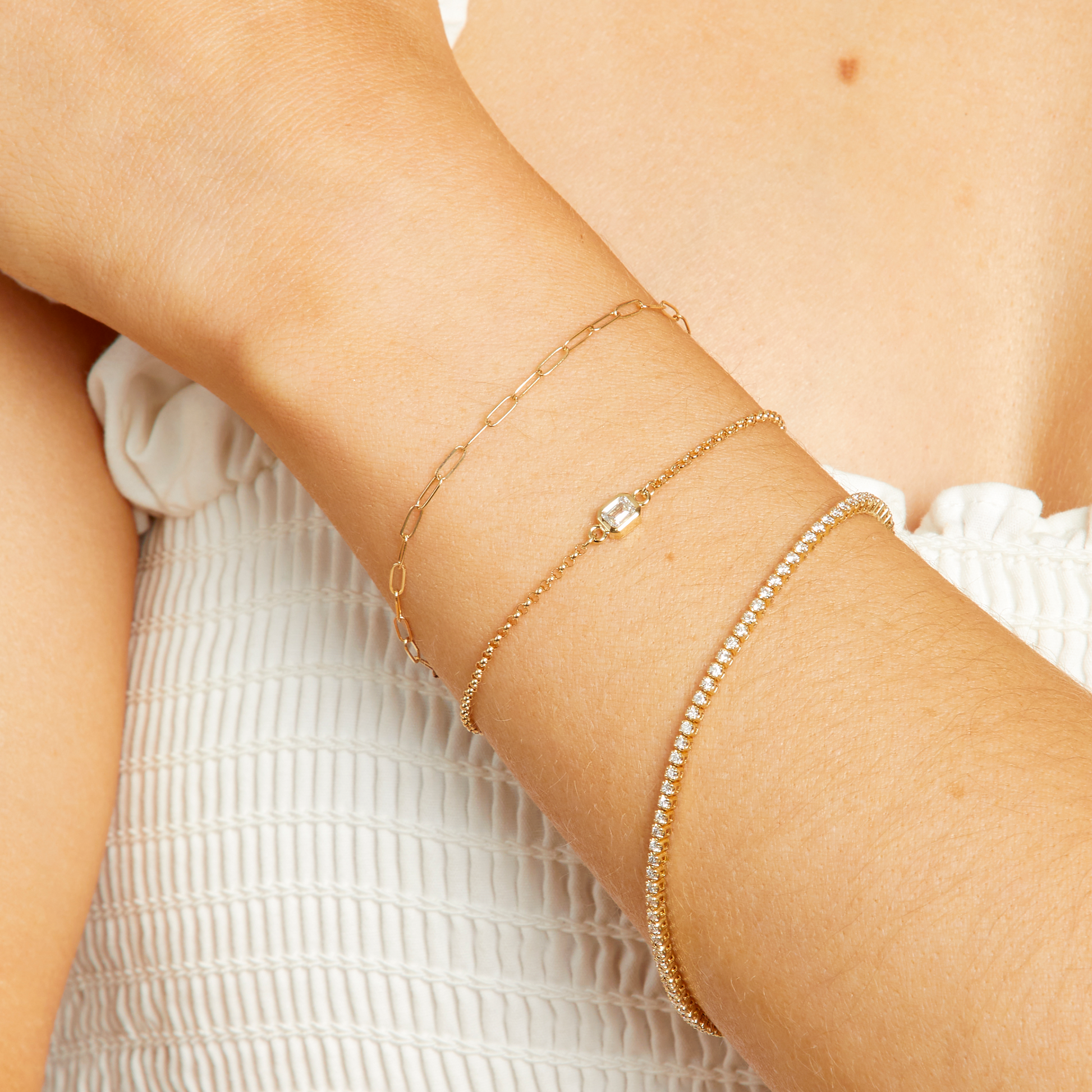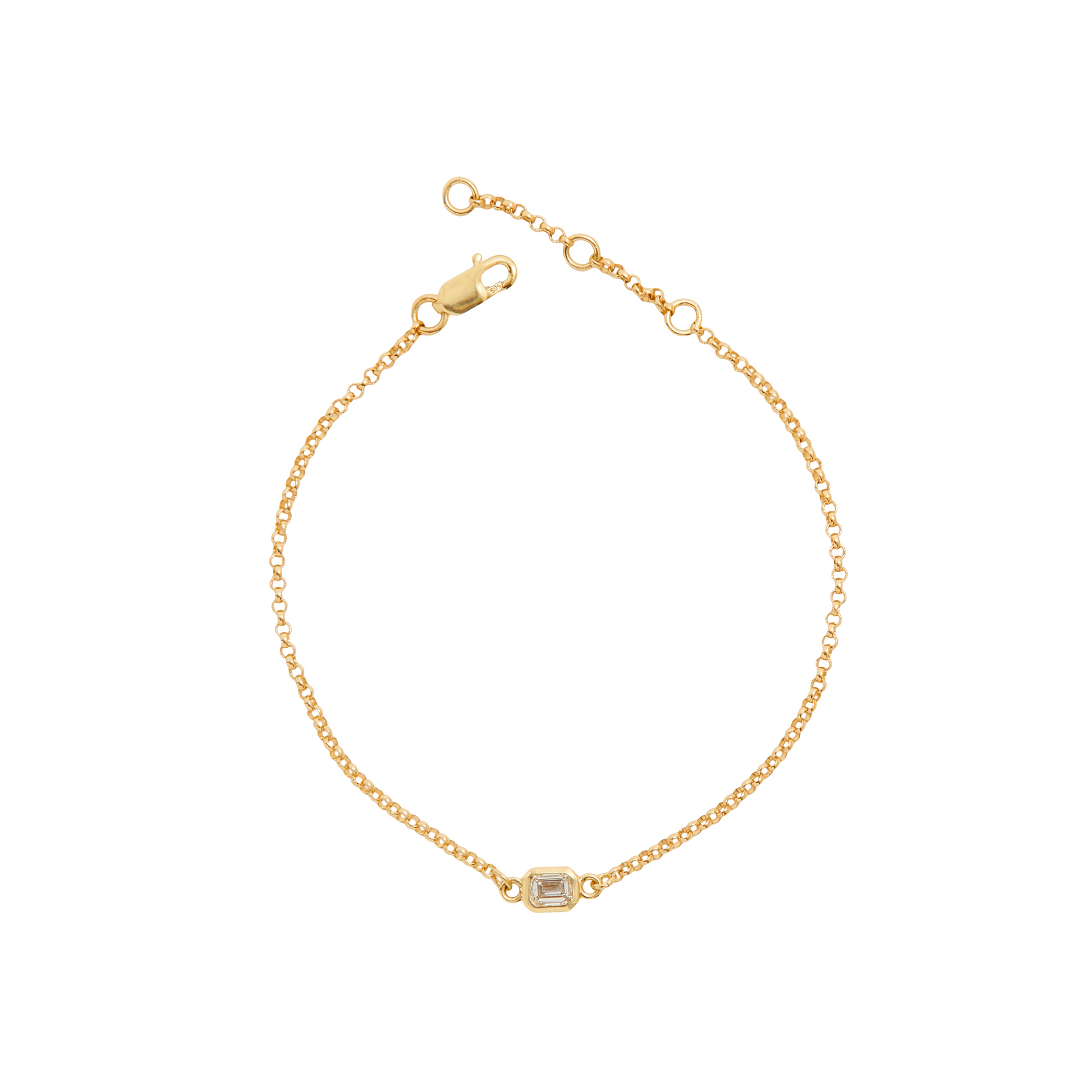 Bezel set Emerald cut Diamond on a gold rolo chain.