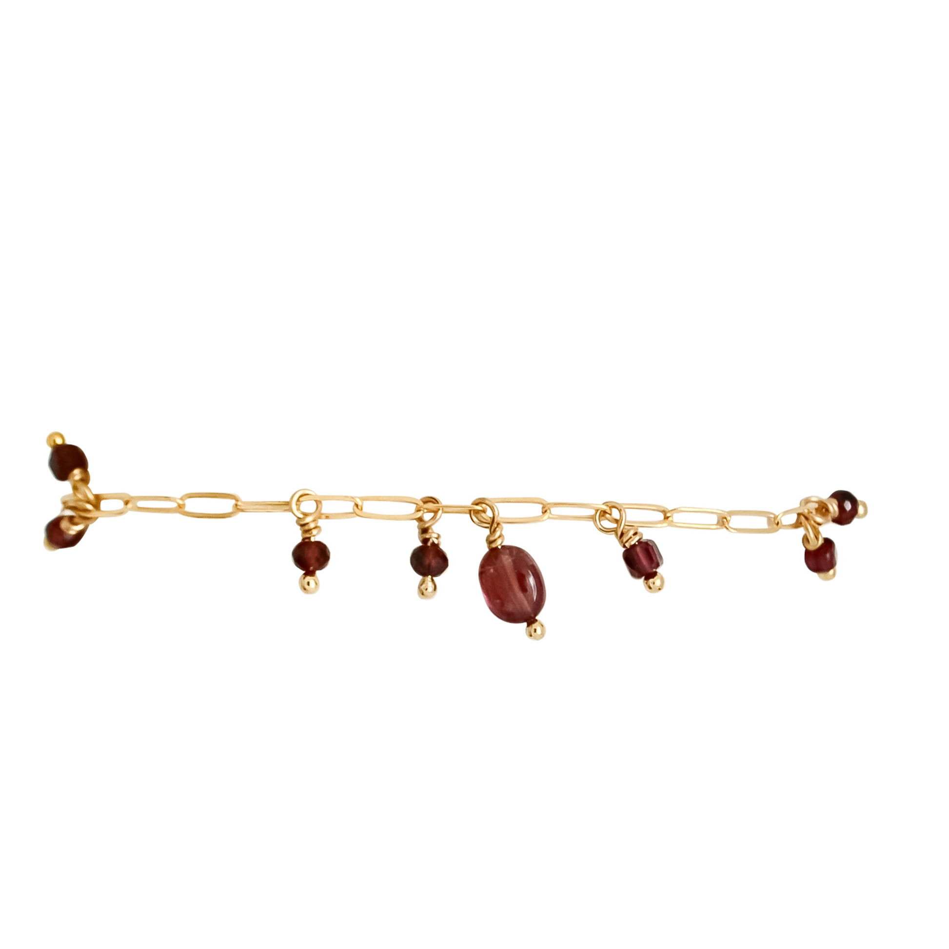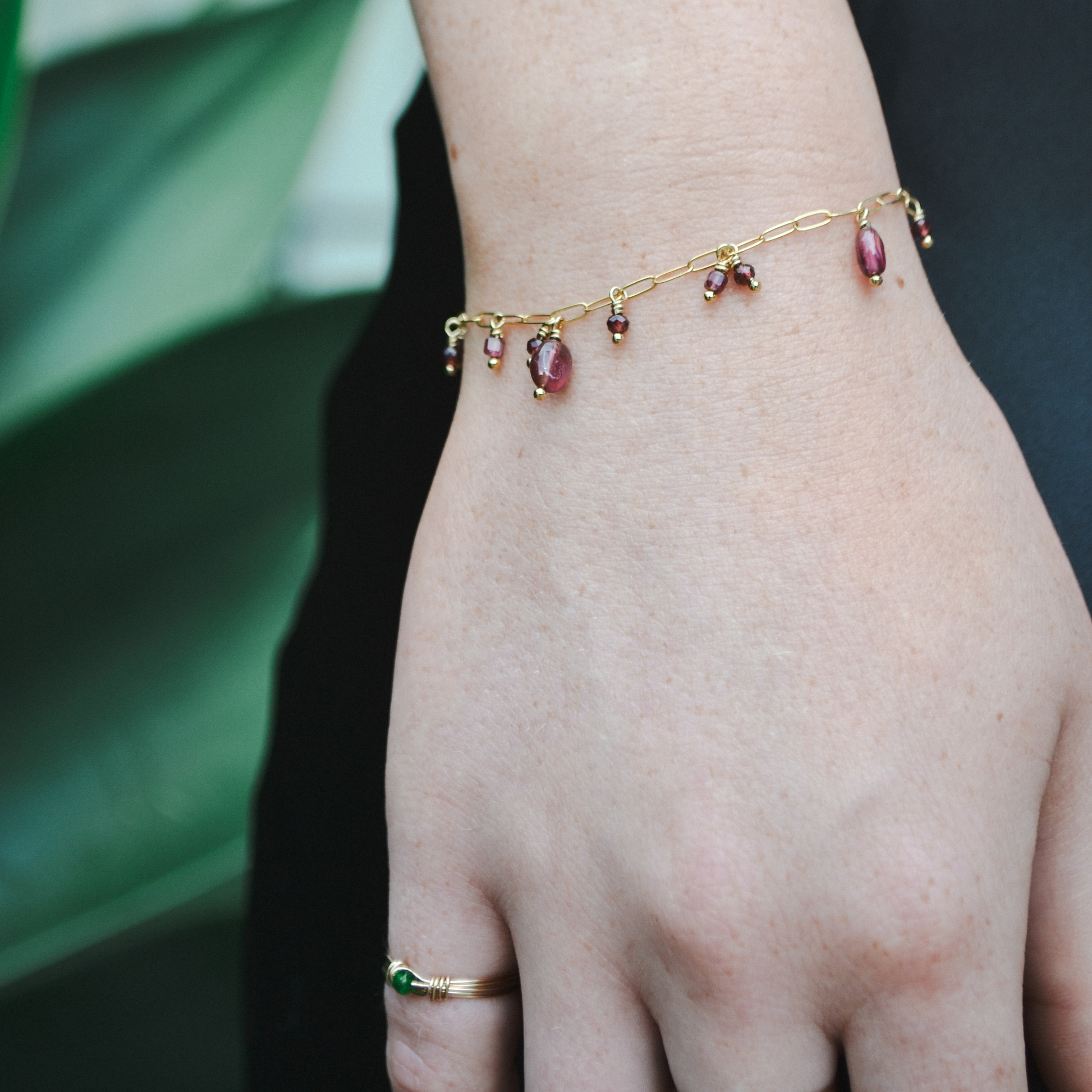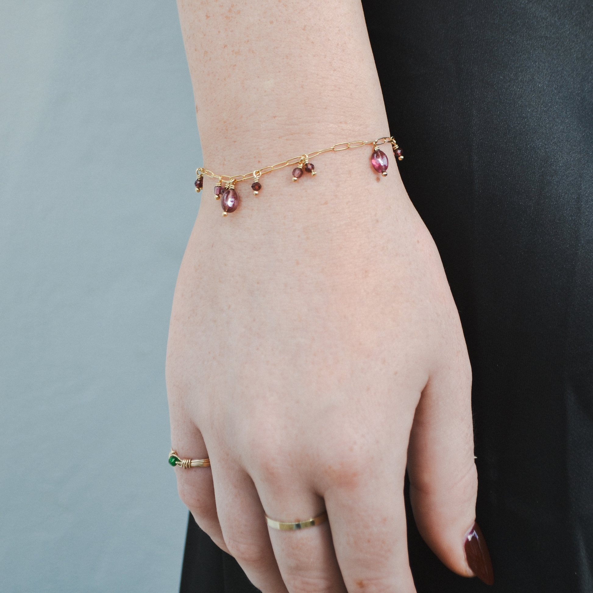 Romance is in the air with this dreamy garnet bracelet. Red velvet gemstones along a glistening paperclip chain, this gorgeous piece is sure to catch the eye of that special someone. Pair with our chandelier earrings in garnet and let the matching gemstones tie together your look, or try our je t'aime bracelet for a similar style that uses pearls.