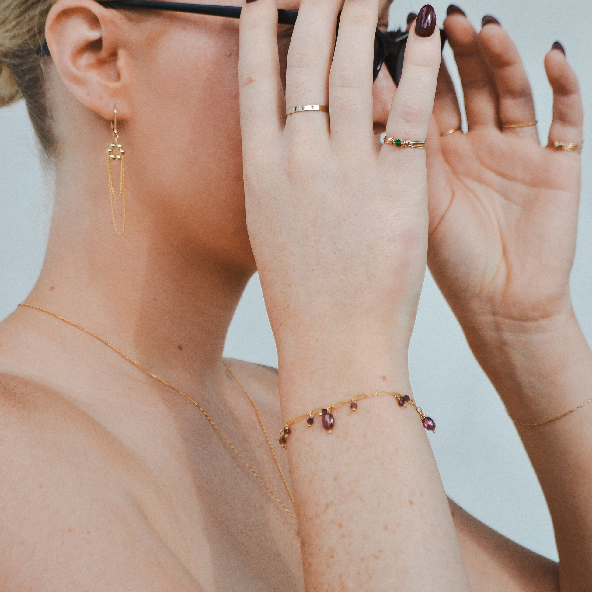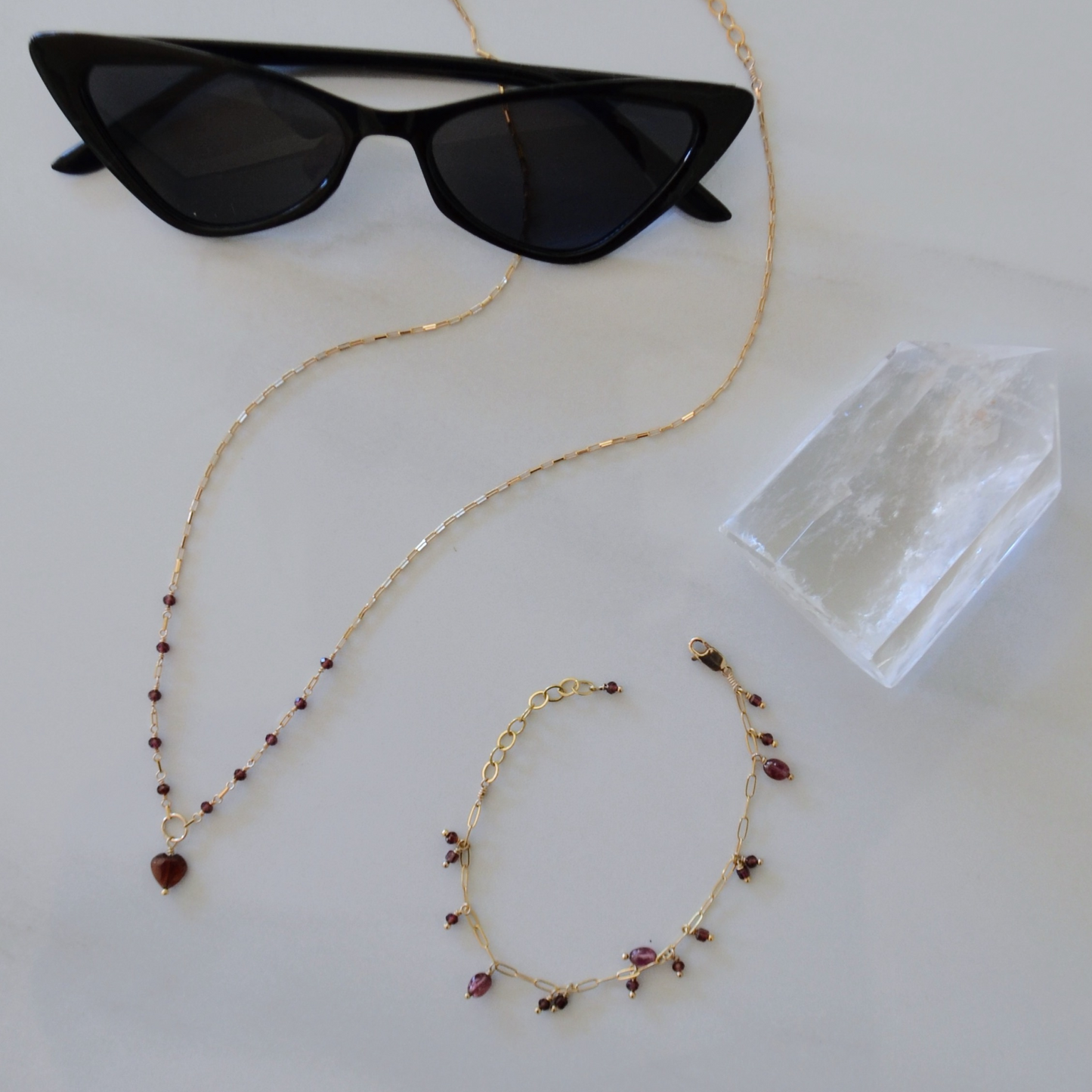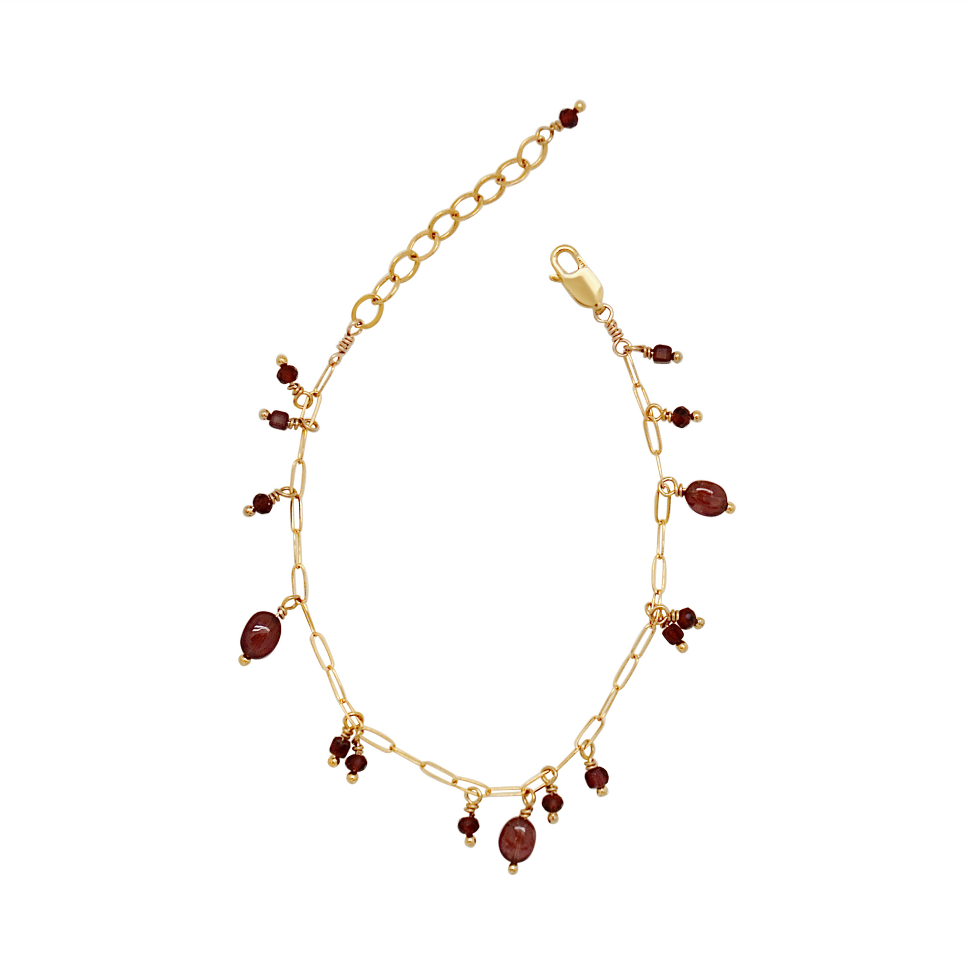 Romance is in the air with this dreamy garnet bracelet. Red velvet gemstones along a glistening paperclip chain, this gorgeous piece is sure to catch the eye of that special someone. Pair with our chandelier earrings in garnet and let the matching gemstones tie together your look, or try our je t'aime bracelet for a similar style that uses pearls.