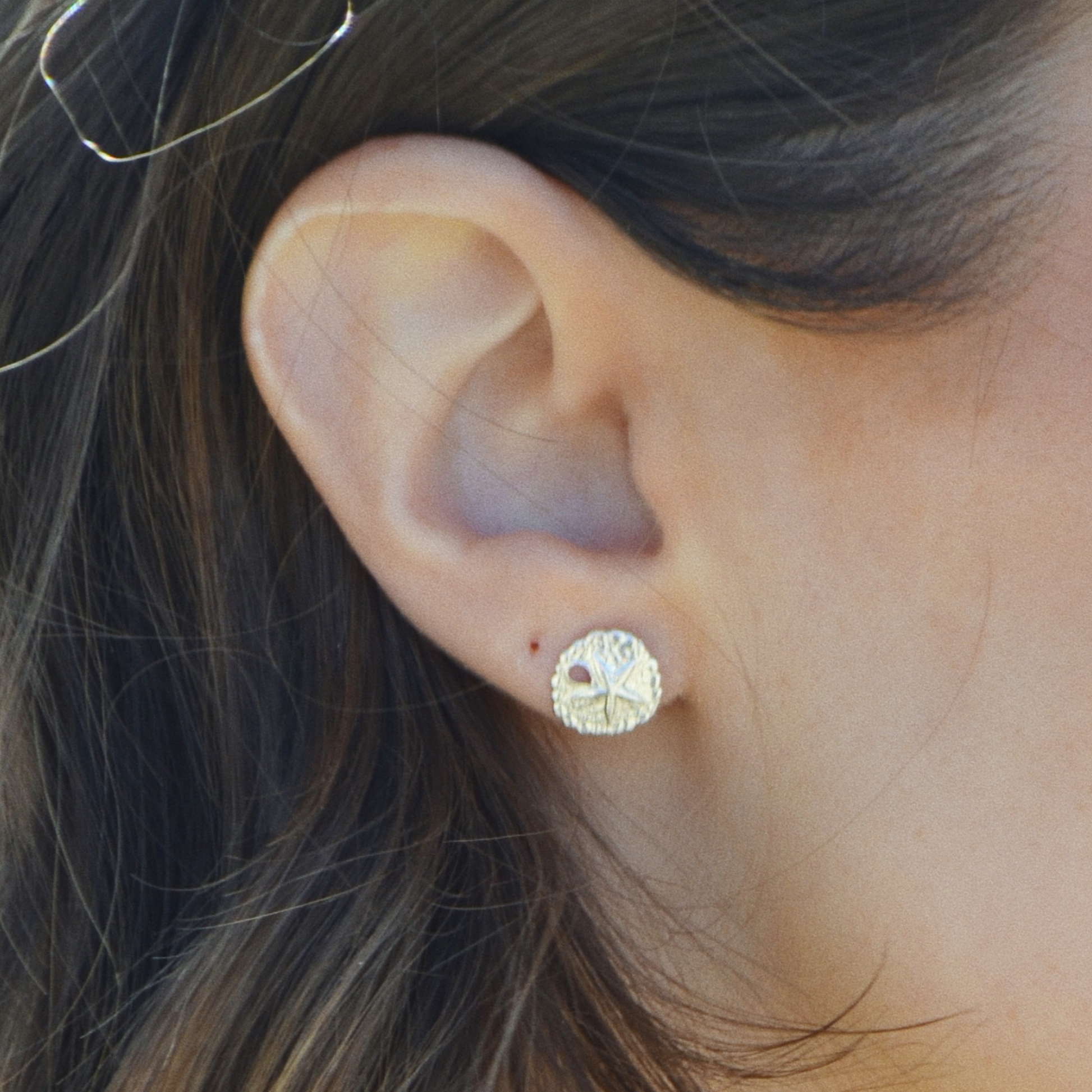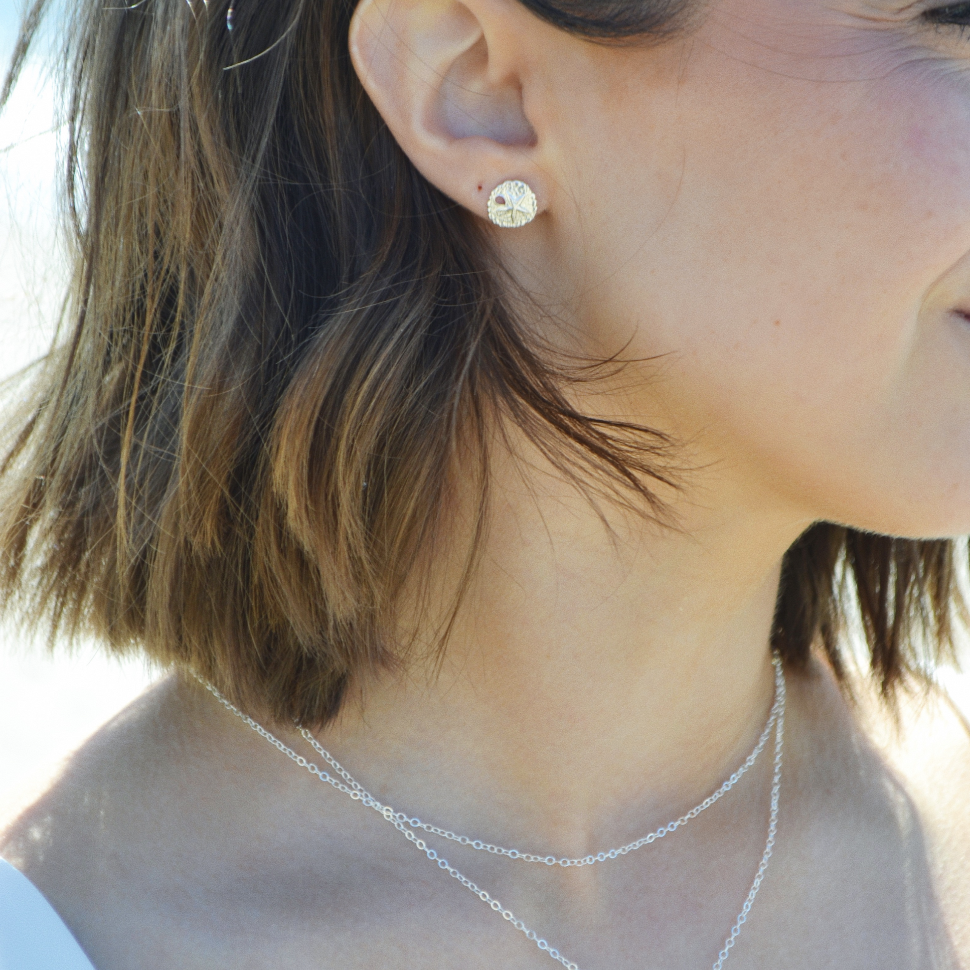 Our popular sand dollar stud earrings - now available in silver! Dainty and delightful, wear these little starfish-shaped studs when you want to invoke the spirit of the ocean.