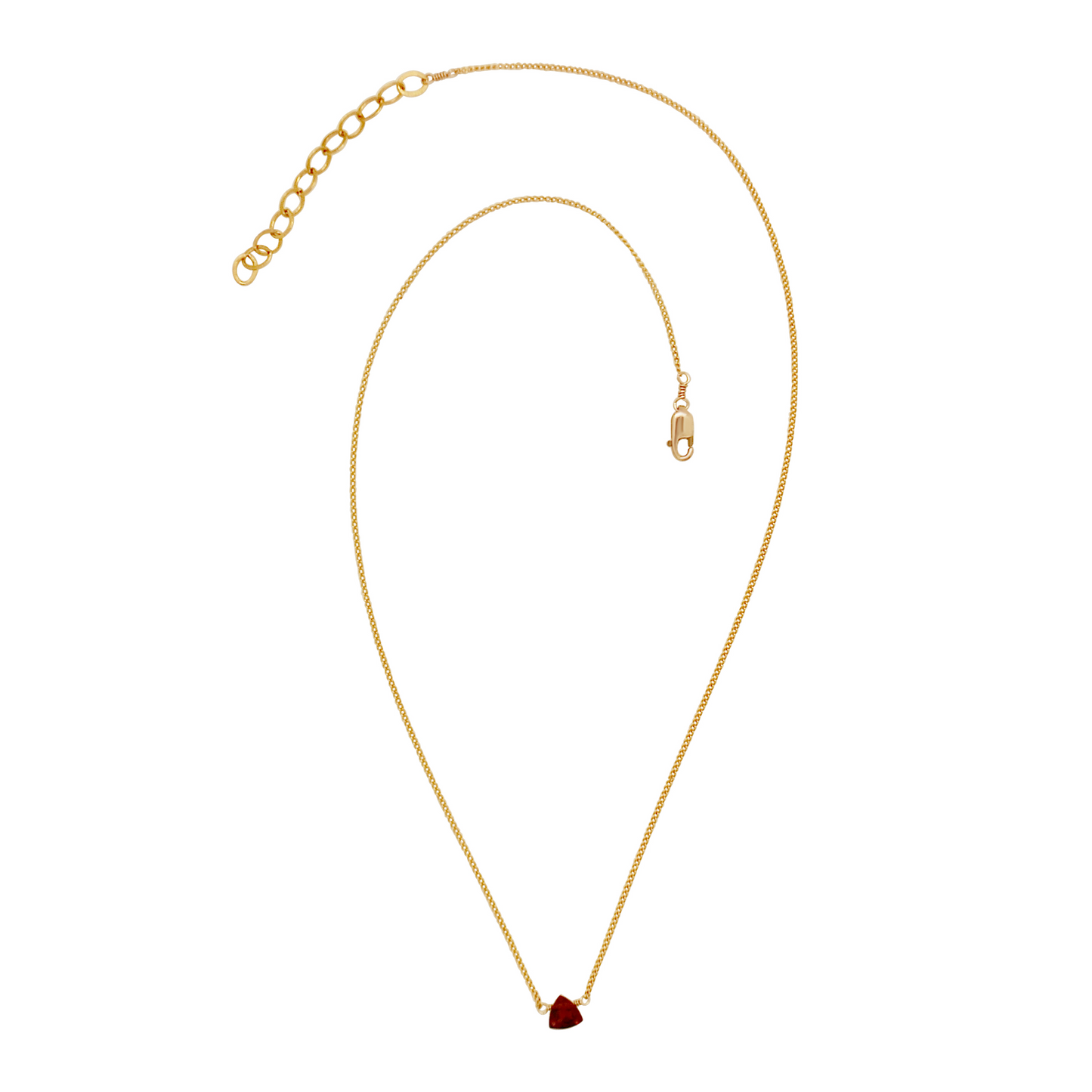 Mini curb chain with a trillion cut red garnet gemstone.