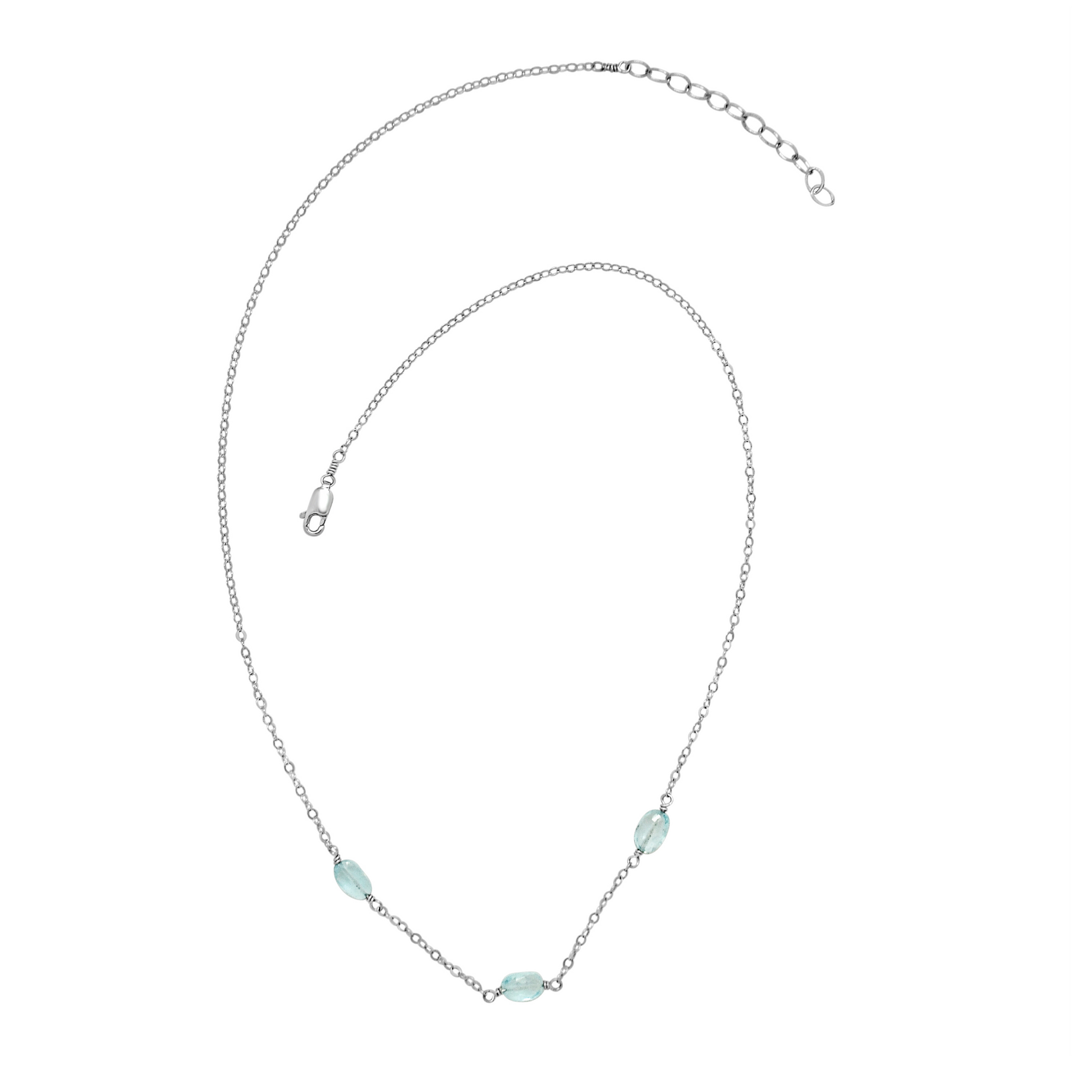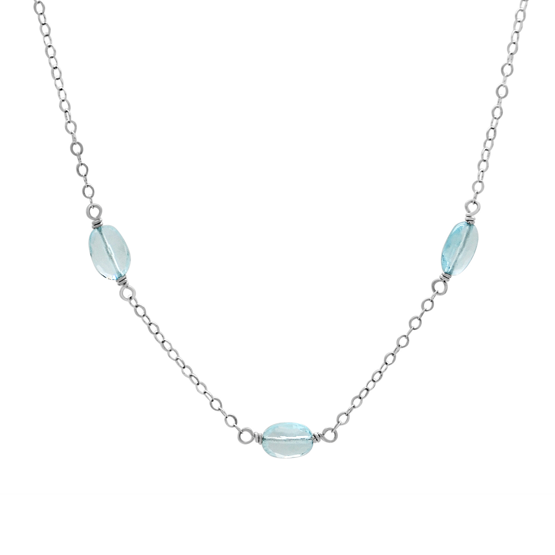 3 Sky Blue Topaz oval stone beads on dainty glimmer silver chain.