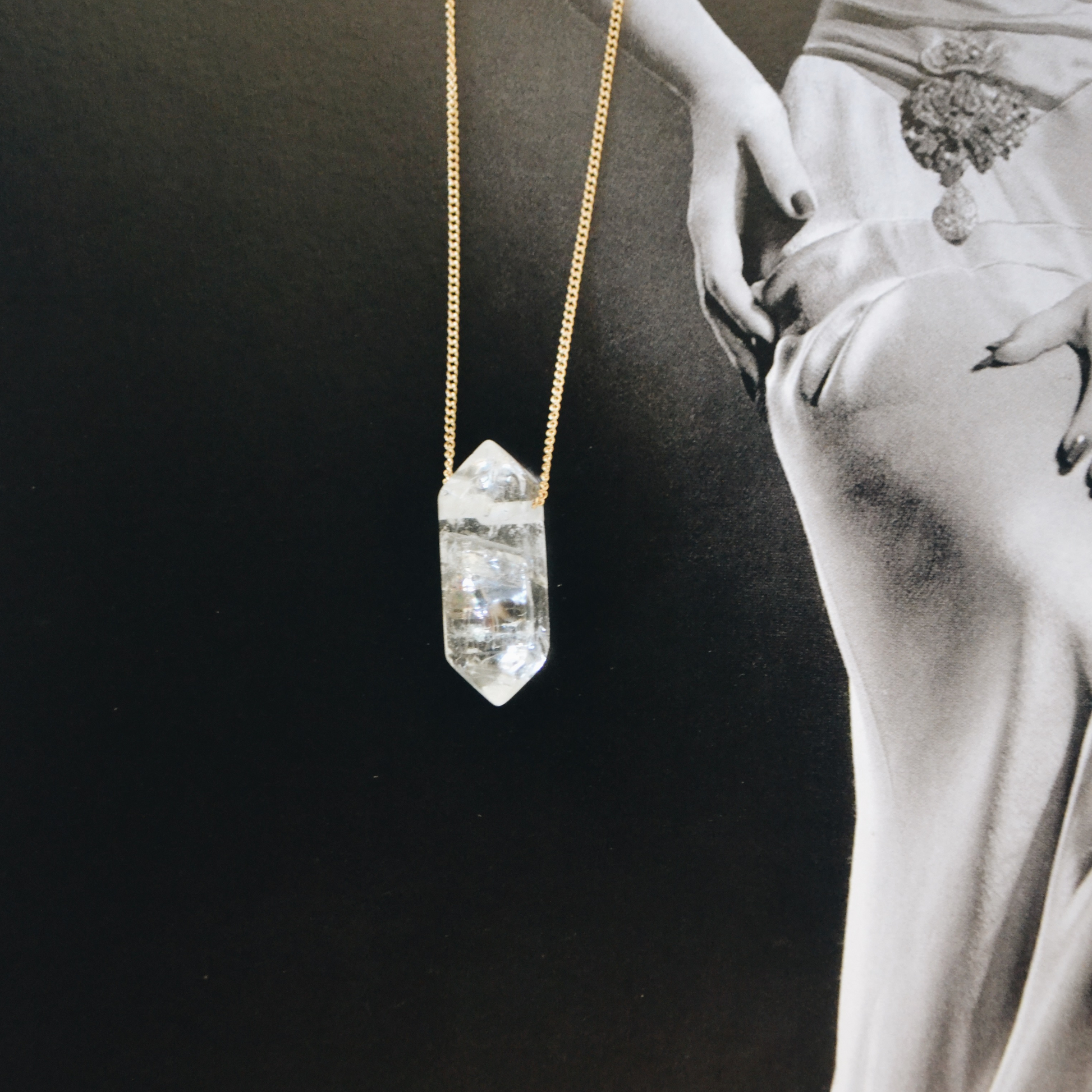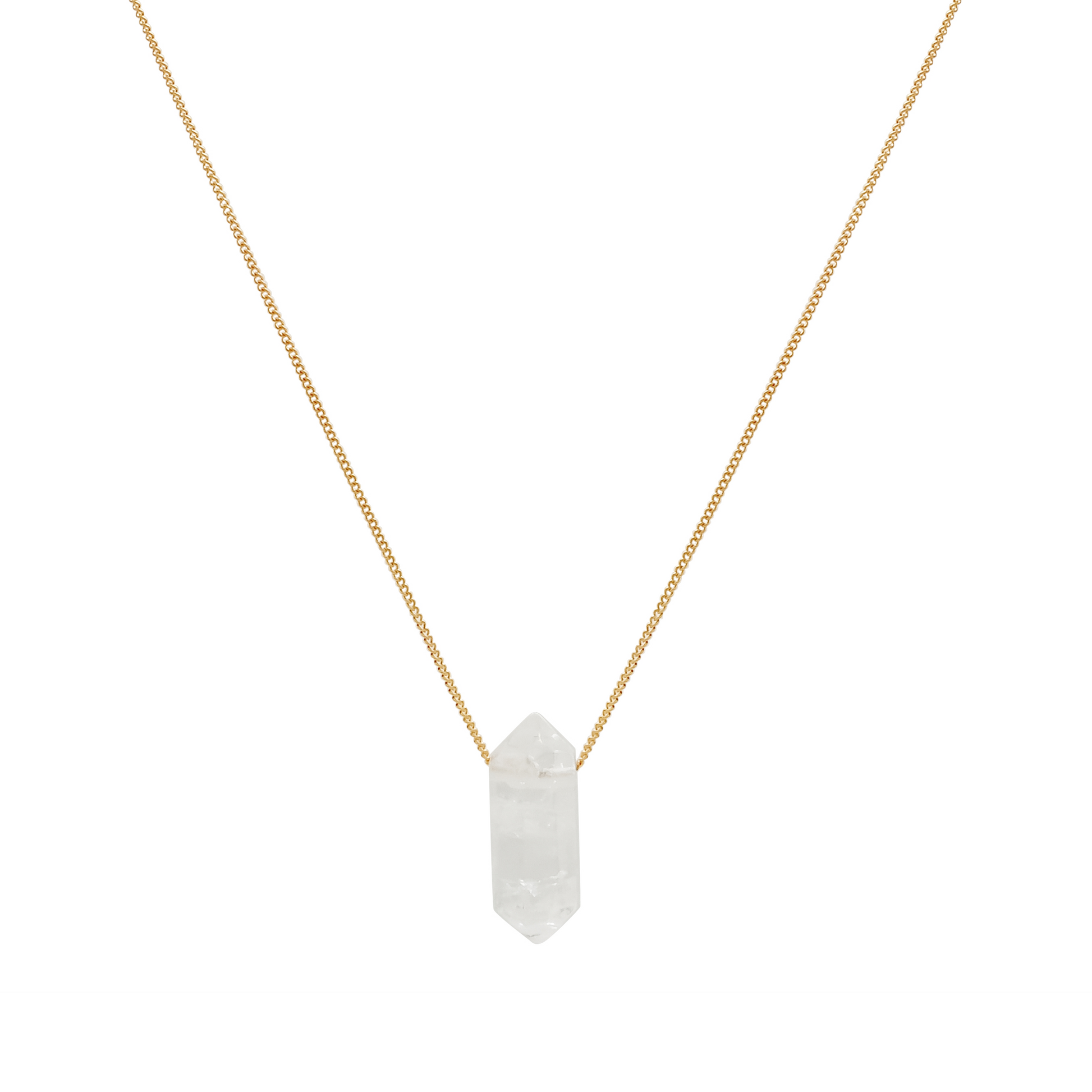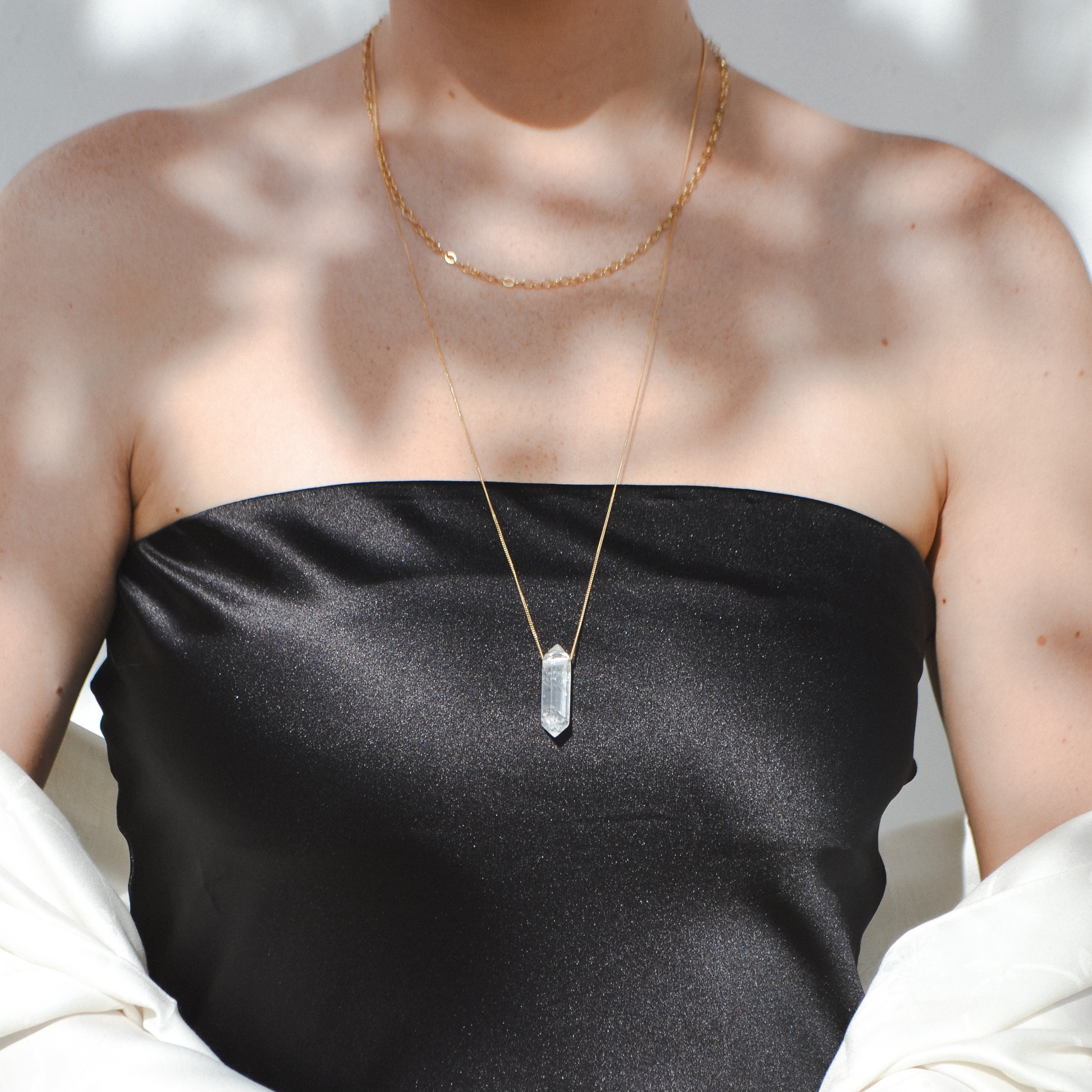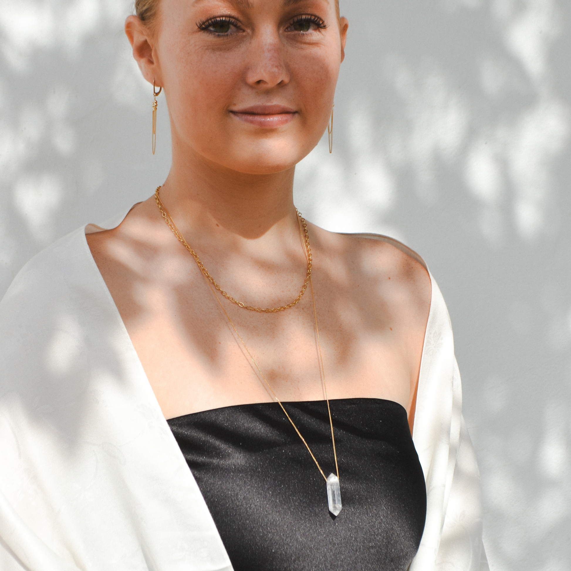 Mini curb chain with a sliding double terminate quartz pendant. Available in a short and long version.
