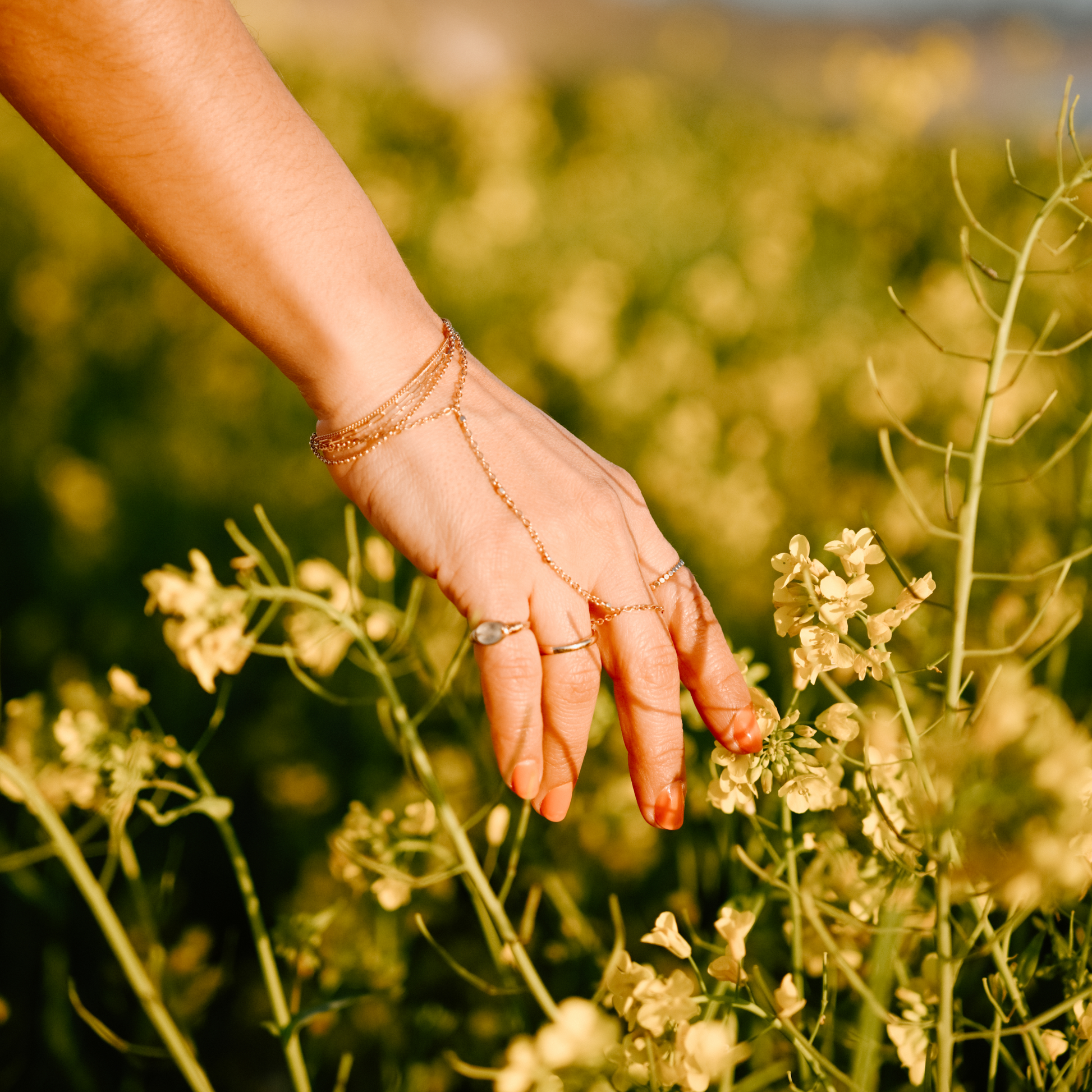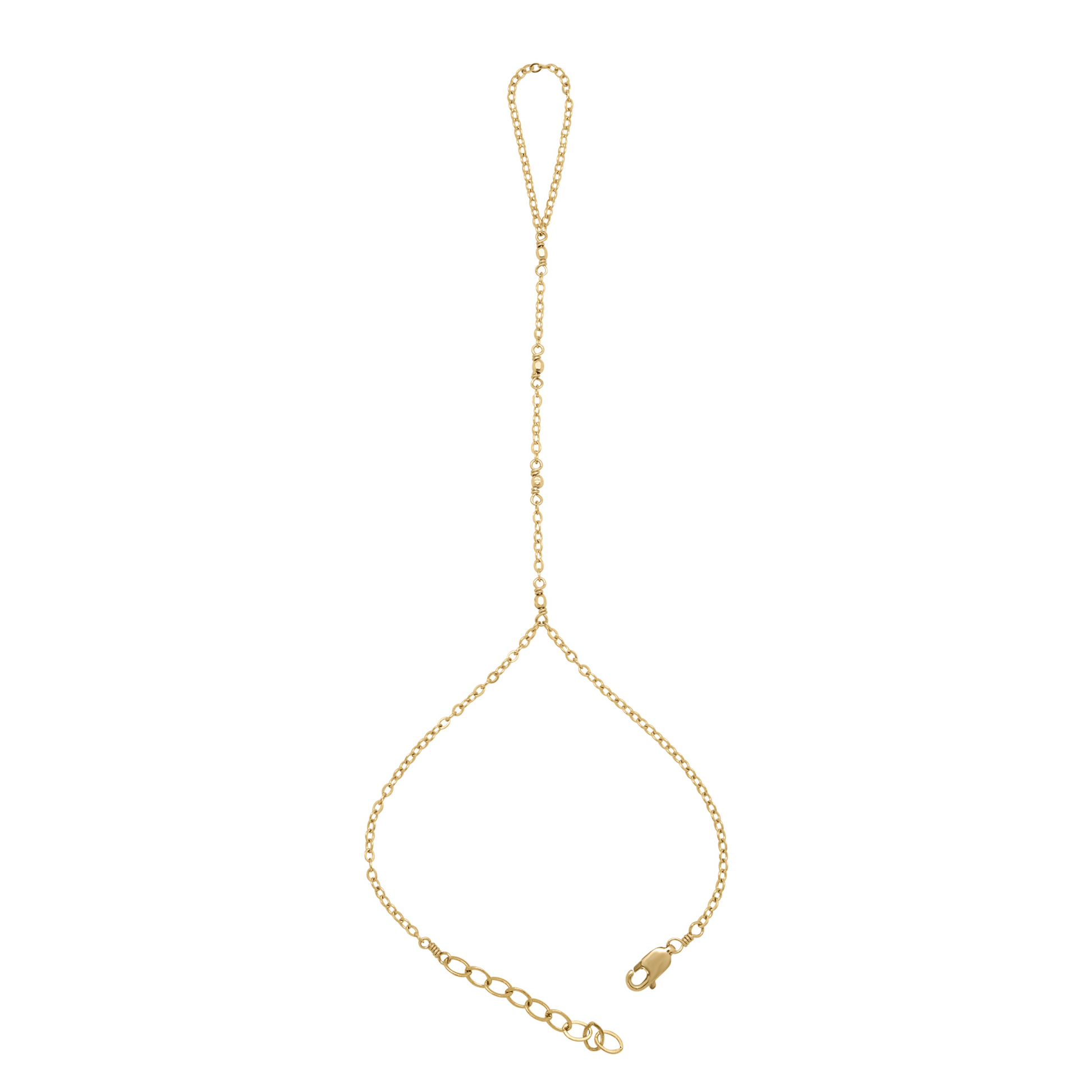 14k gold-filled glimmer hand chain fitted between the wrist and middle finger with gold bead details.