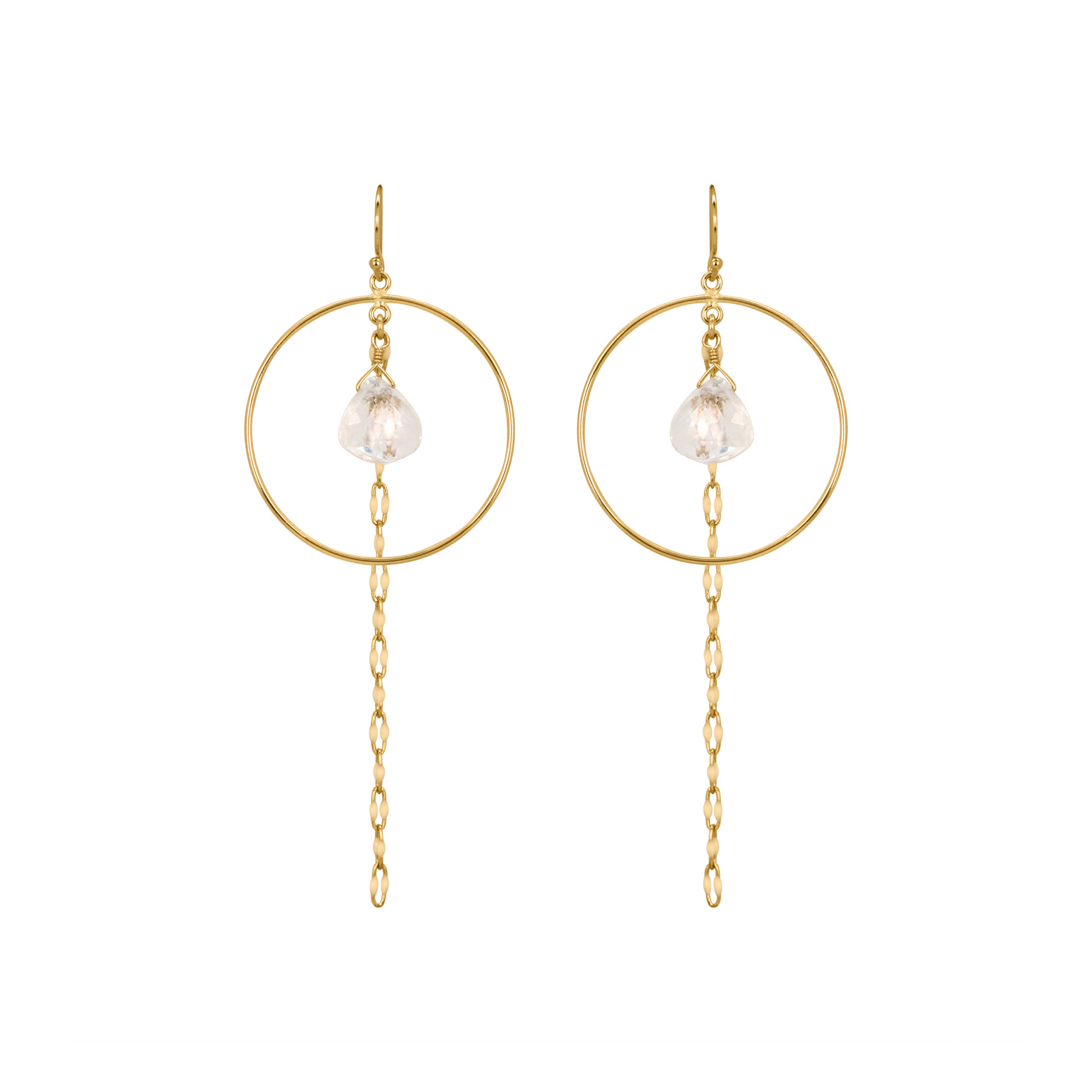 Gold filled french hook earrings with large hanging hoop, clear Kunzite stones, and white enamel drawn cable chain.