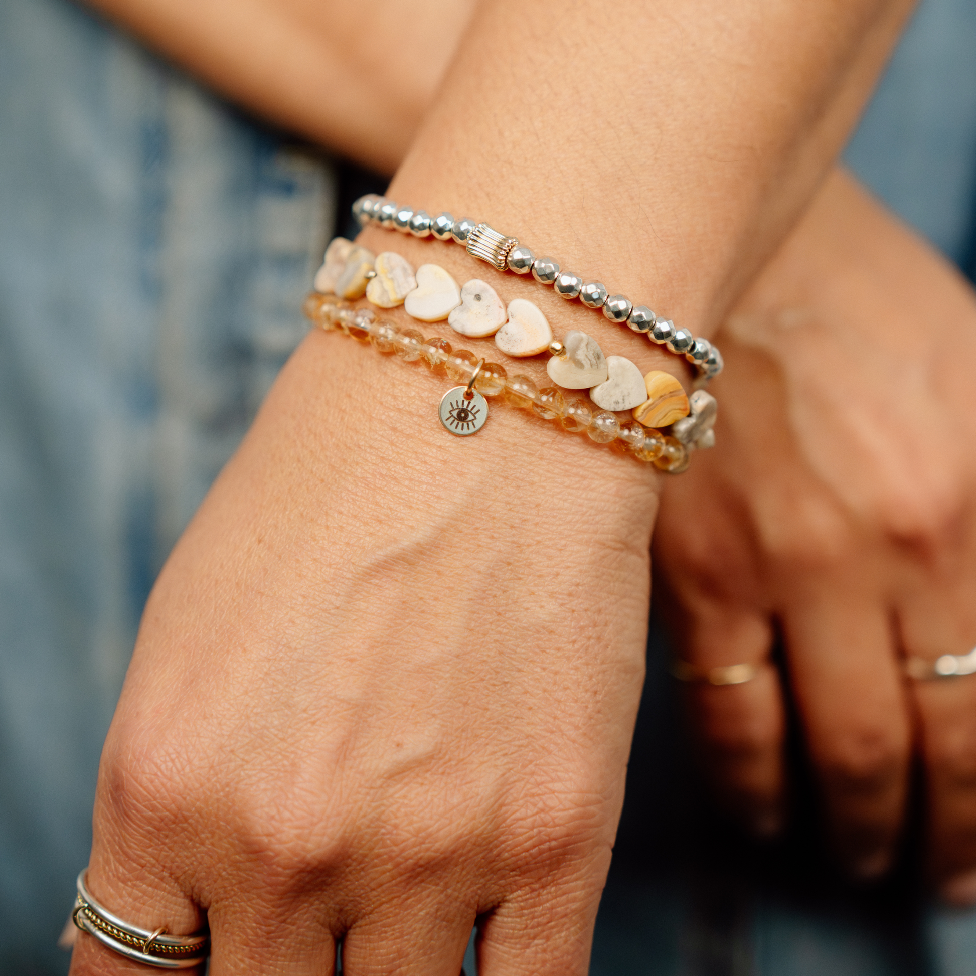 Pull-on bracelet with heart shaped lace agate beads with gold filled accents.
