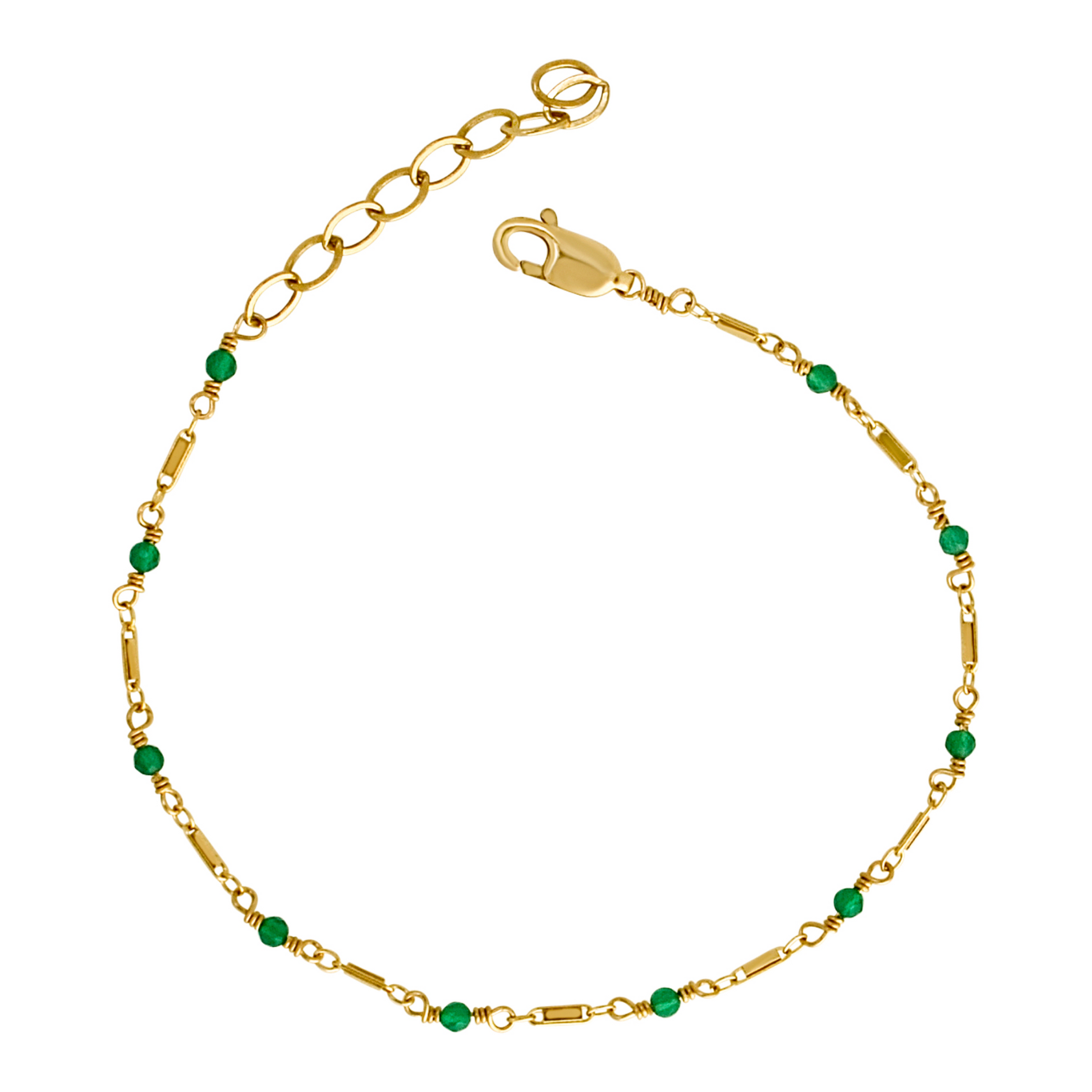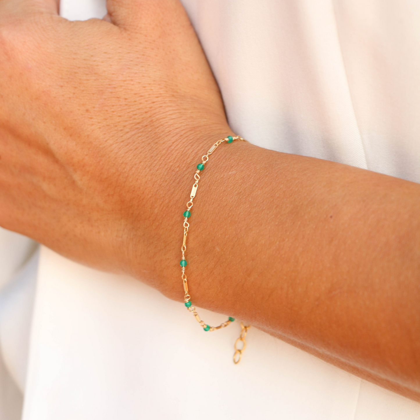 This bracelet is effortless and dainty in all the right ways. The tiny green onyx gemstones are faceted and sparkle. Perfect for everyday wear or a night on the town.