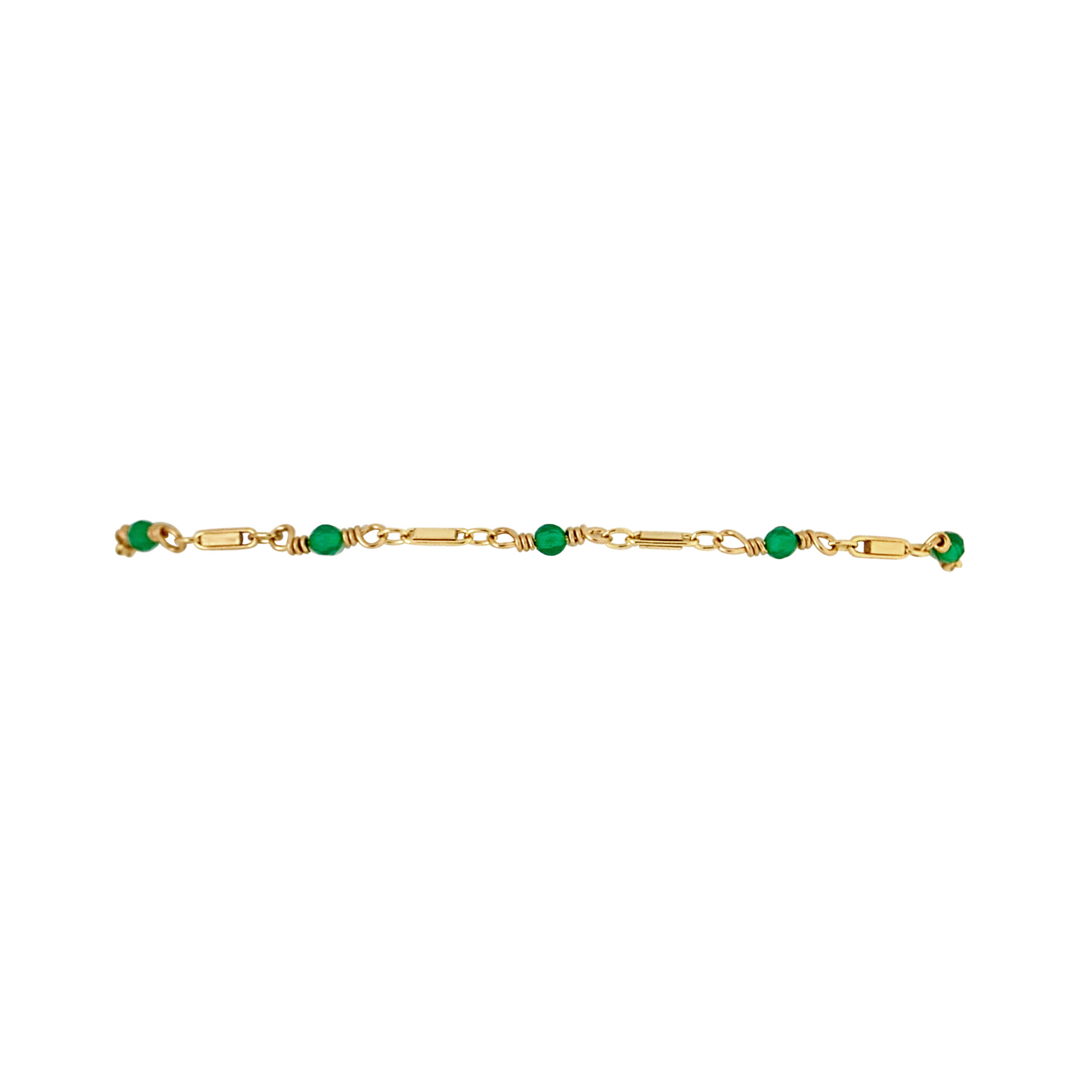 Hand wire wrapped tiny green onyx on gold filled bar chain.