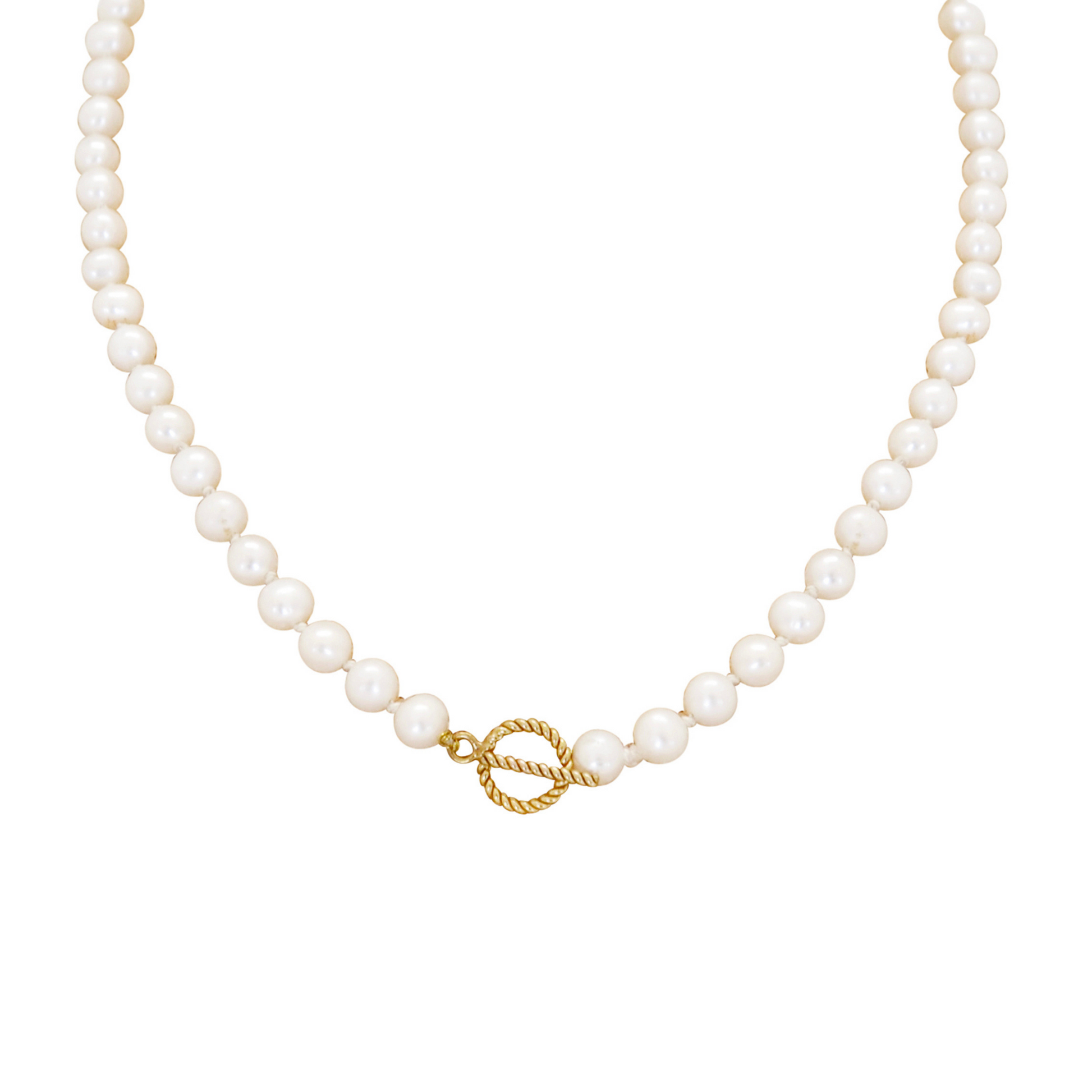 Knotted freshwater white pearl necklace with toggle clasp.