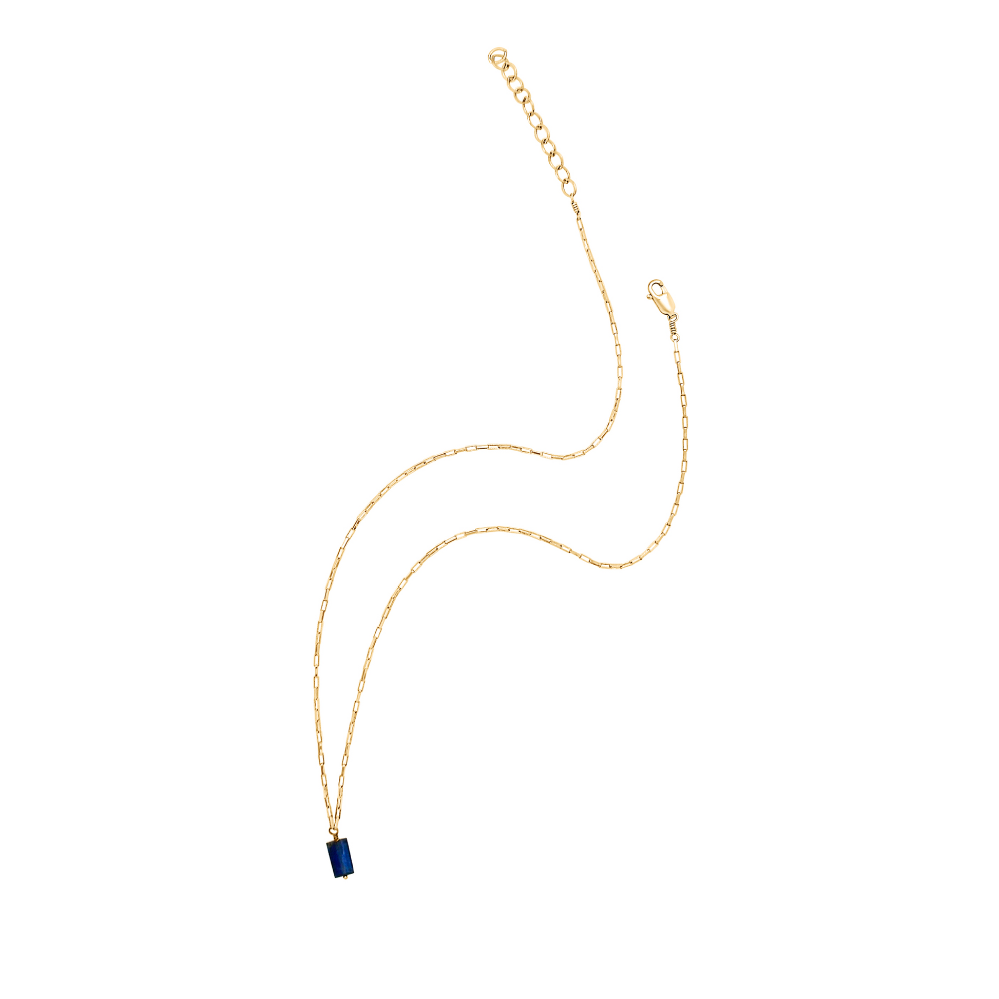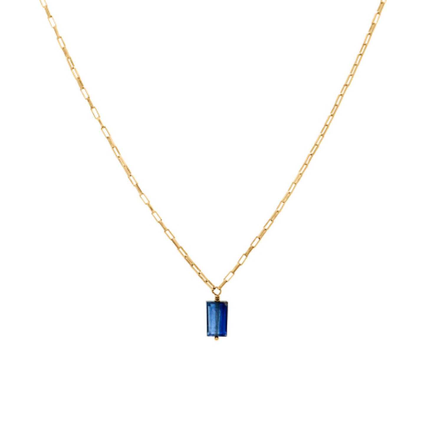 Wire-wrapped carefully onto a shining venetian chain, this Blue Kyanite stone evokes the deep indigo feathers of the blue nightingale. Wear this when you want channel the freeing energy of the Kyanite.