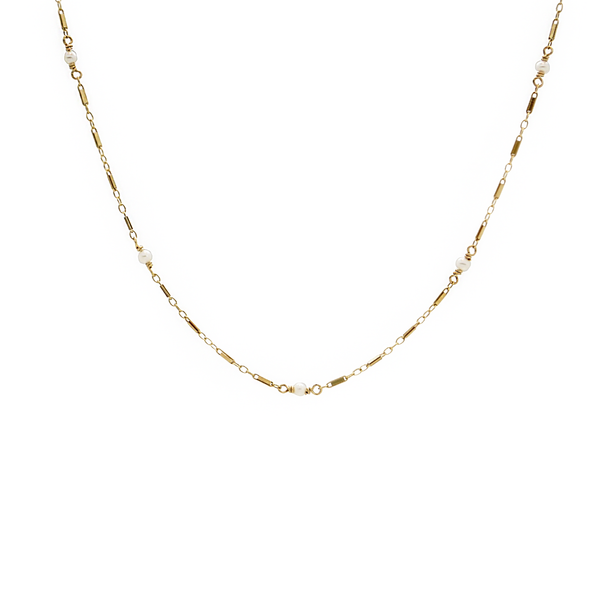 Bar chain featuring ten wire-wrapped White Pearl beads.
