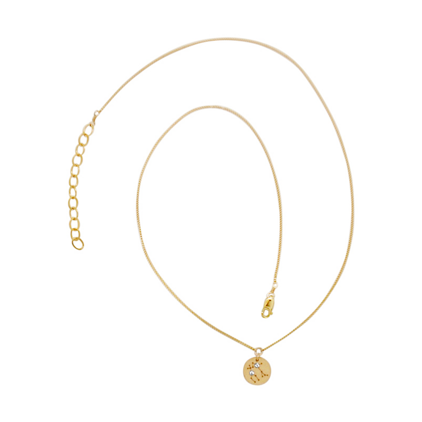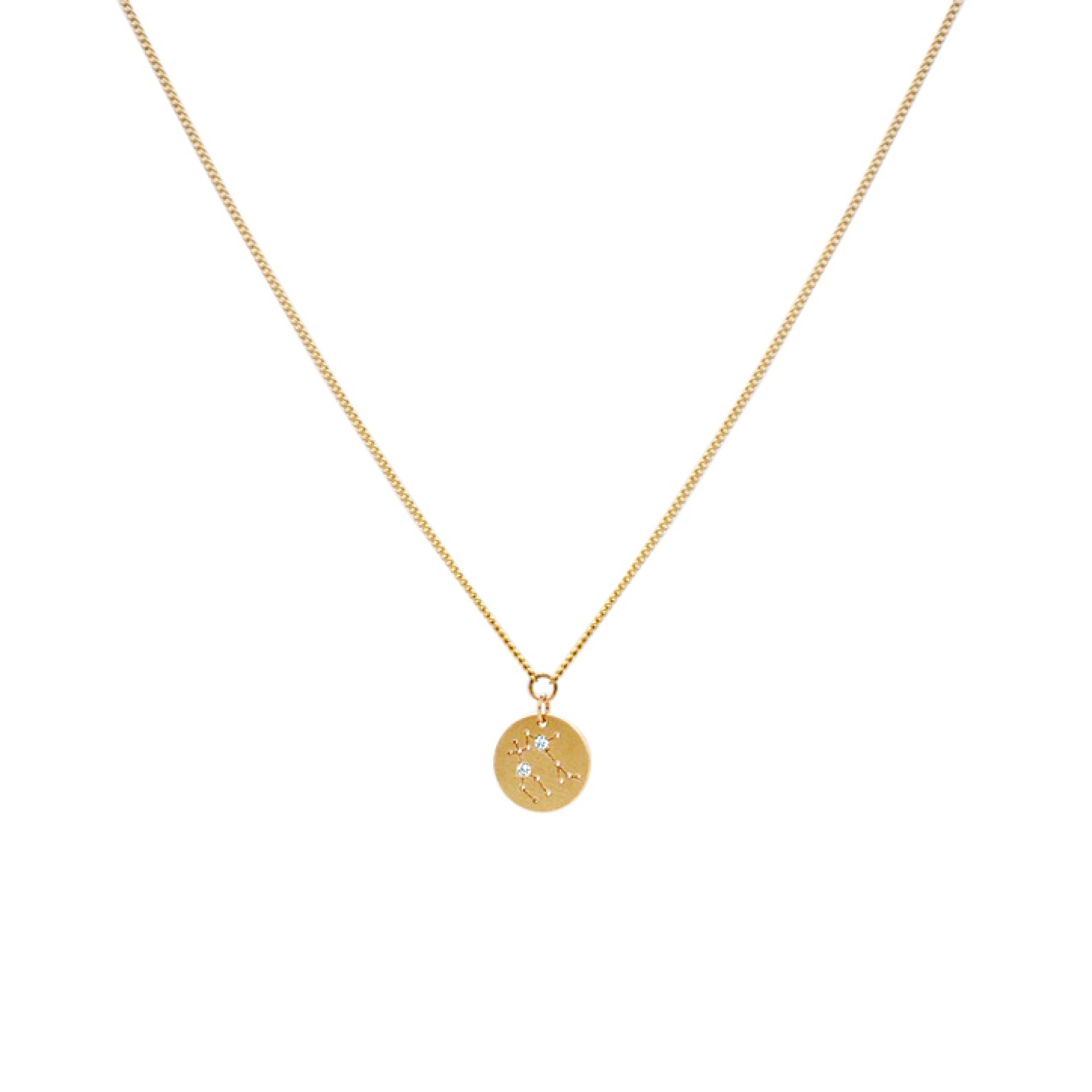 Dainty curb chain necklace with a round disc pendant featuring constellation zodiac sign with small cubic zirconia stones.